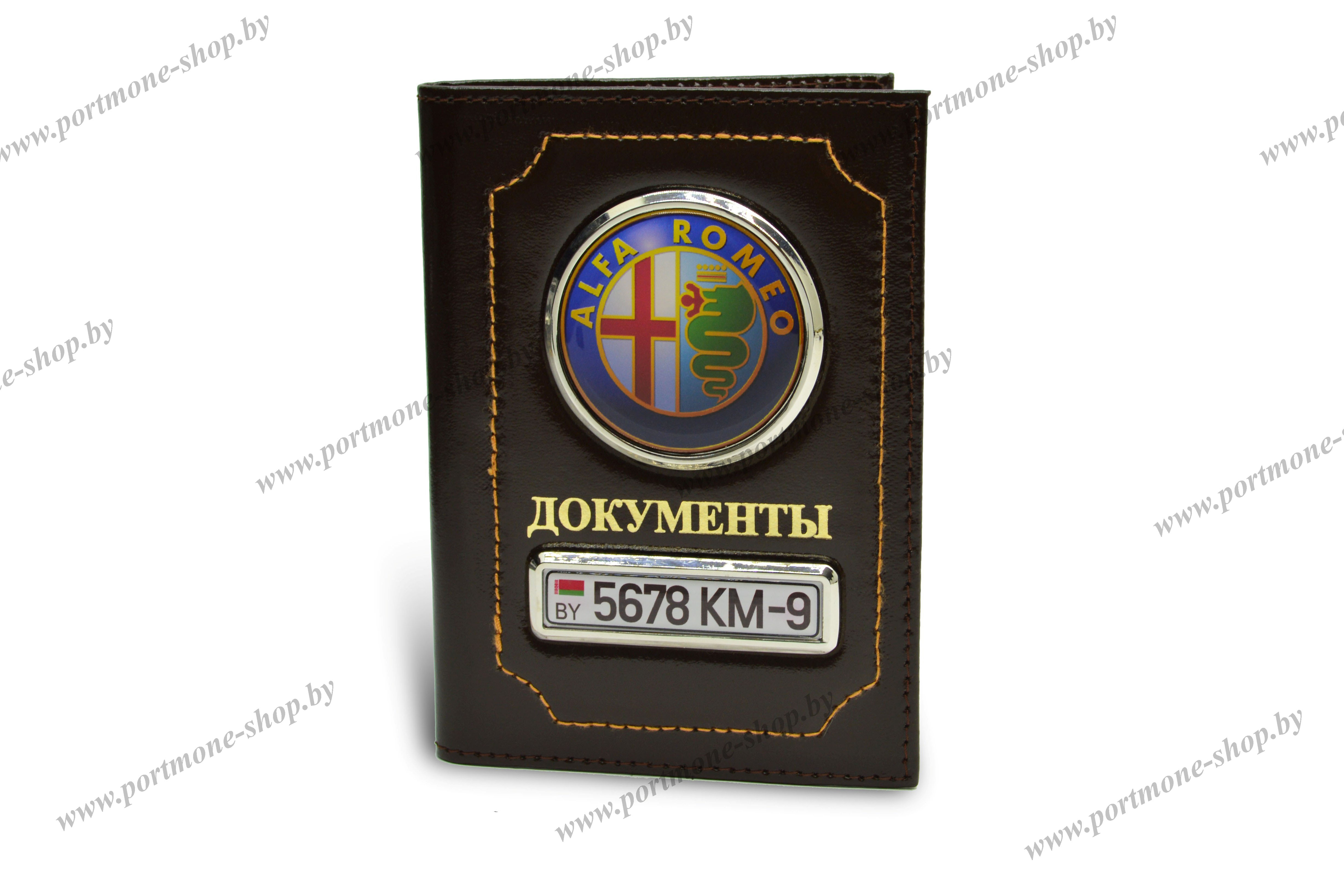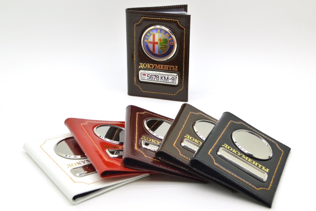 Сувенирная обложка для автодокументов с эмблемой автомобиля и государственным регистрационным знаком. Выполнена из натуральной кожи. Логотип автмобиля и номерной знак закрыты полиуретановыми линзами, защищащующими их и придающими дополнитьельный объём. Линзы устойчивы к ультрафиолету и не желтеют.