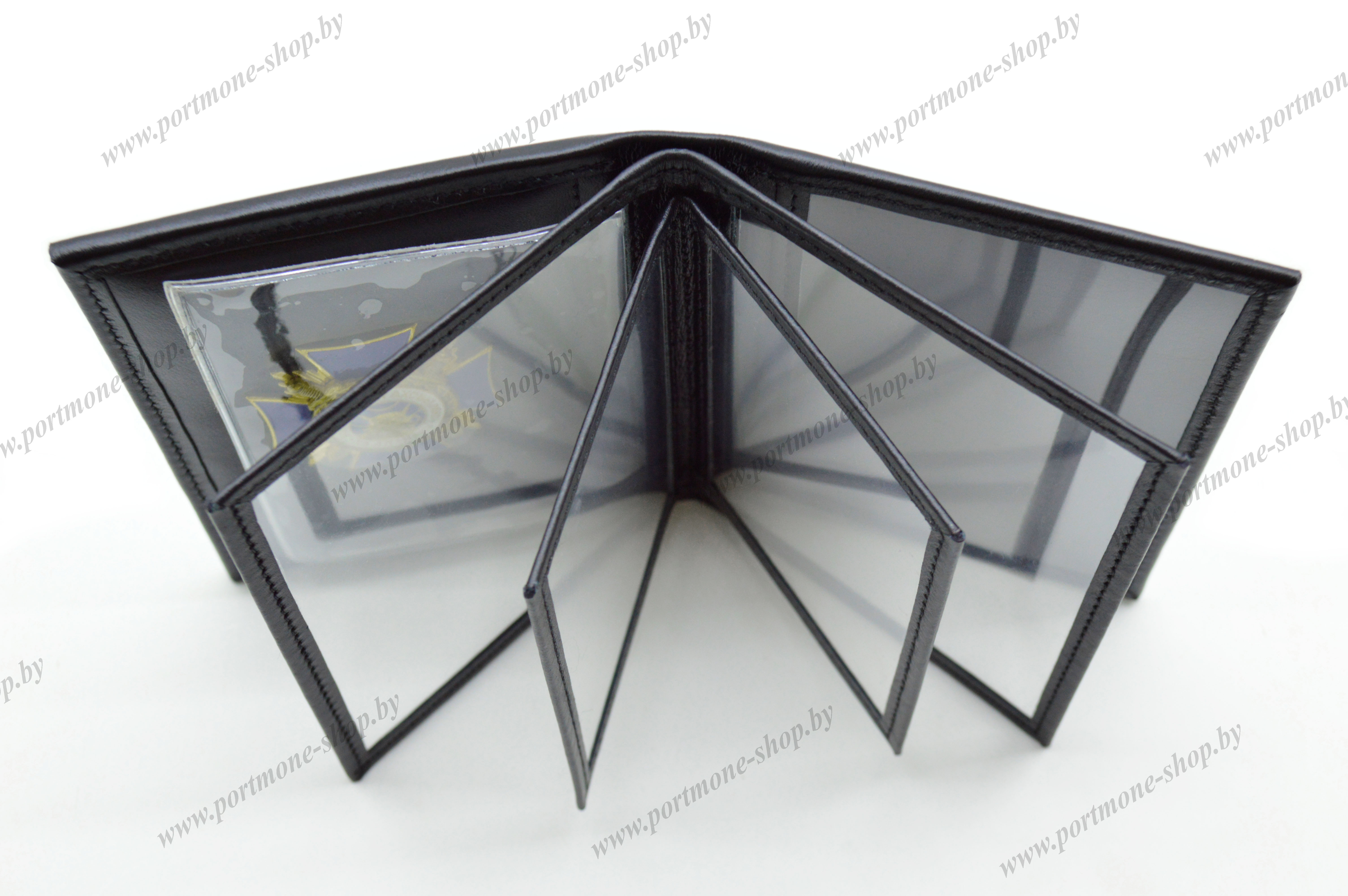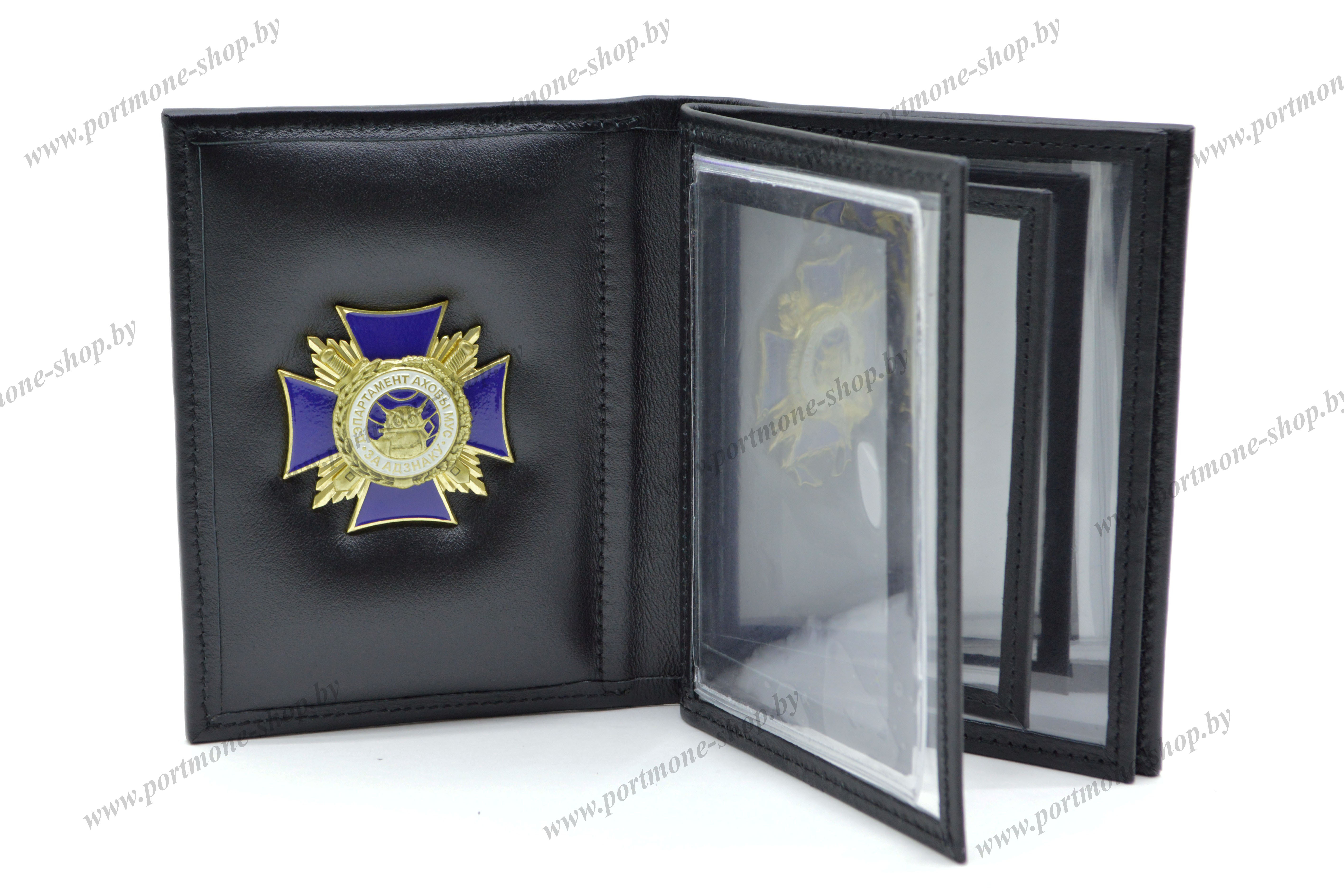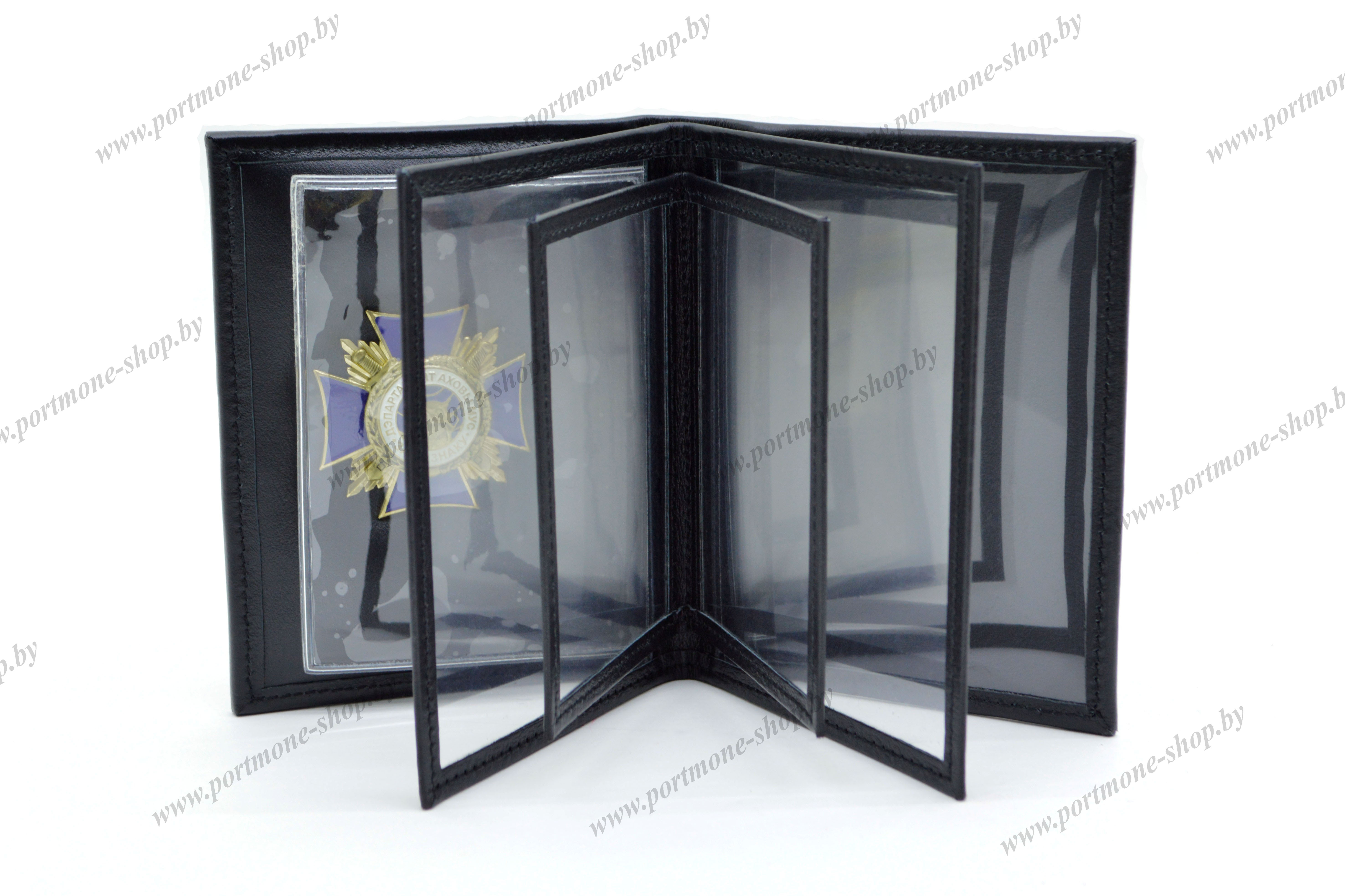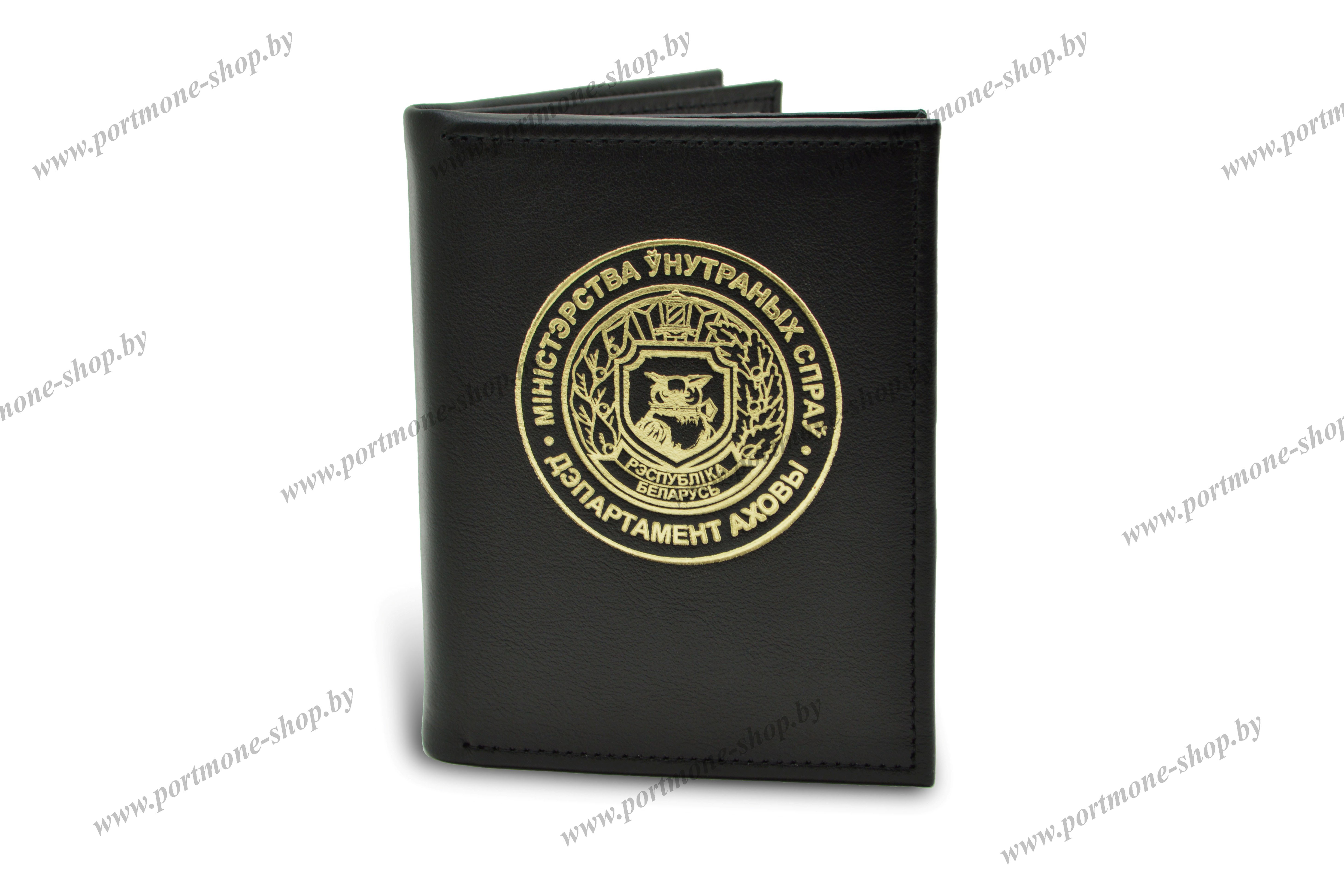 Обложка для сотрудников Департамента охраны МВД Республики Беларусь. Материал - натуральная кожа чёрного цвета. Кроме служебного удостоверения (105*75мм) в обшитые кожей карманы поместятся: заместитель на табельное оружие и радиостанцию, права, автодокументы и пр.