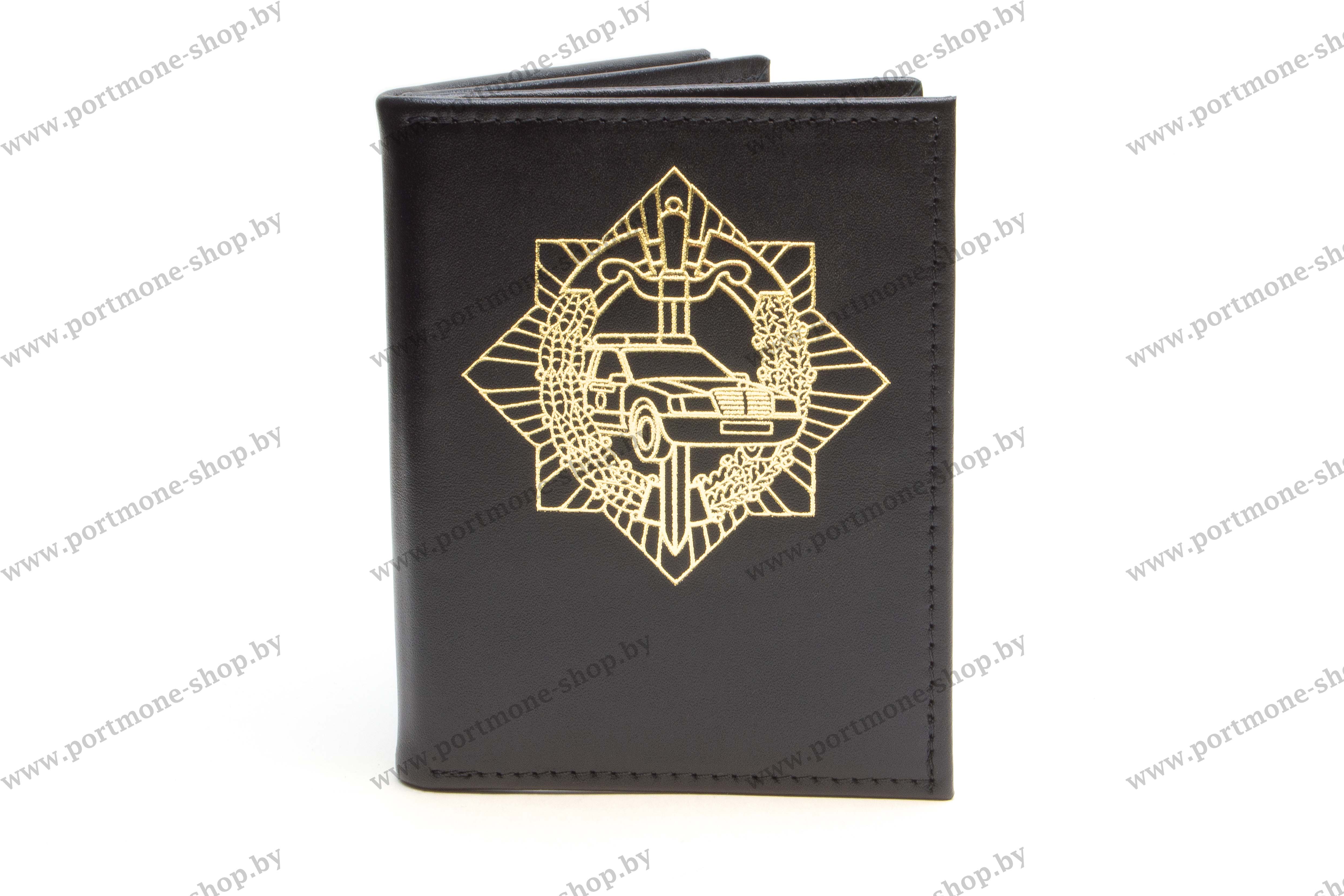 Сувенирная обложка для автодокументов сотрудников Государственной авто инспекции МВД Республики Беларусь из натуральной кожи. На первом развороте имеется прозрачный карман для документов 105*75мм. По центру расположены в зависимости от модификации один или три небольших отсека для документов размером 95*65мм (водительское удостоверение, пропуск, банковская карточка) и два больших отсека для иных документов размером до 105*75мм (техпаспорт, страховка в сложенном виде и пр.). На последнем развороме имеются 2 прозрачных кармана для документов 105*75 (один прозрачный, второй - из кожи). На лицевой стороне нанесено золотое тиснение: эмблема ГАИ Республики Беларусь. Под заказ возможно нанесение других тиснений (примеры в галерее к товару), а так же установка любых винтовых знаков (предоставляются заказчиком).