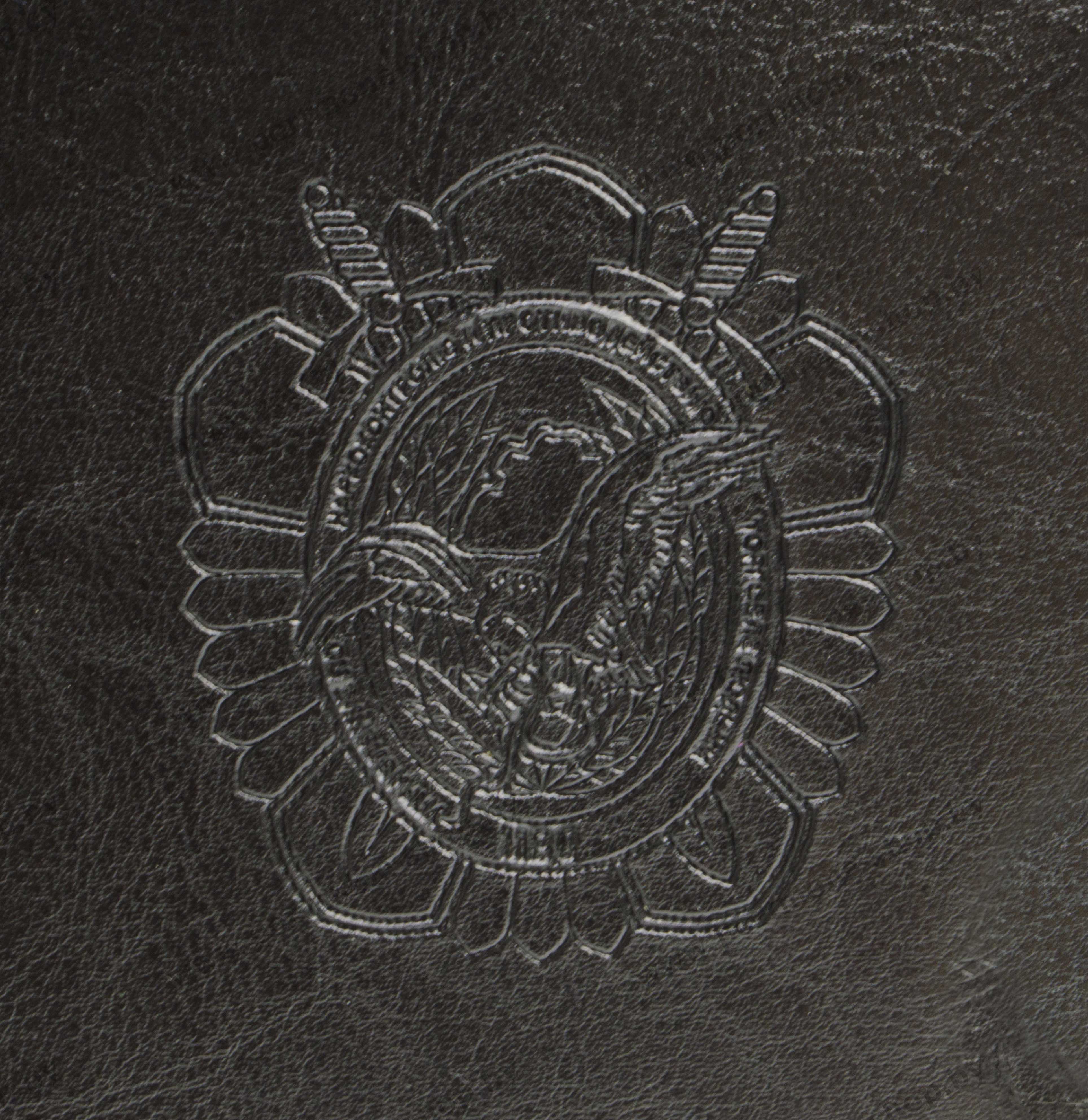 На лицевой стороне нанесено золотое тиснение: эмблема УНиПТЛ КМ МВД РБ. По желанию к ней может быть добавлена надпись "Министерство внутренних дел Республики Беларусь".