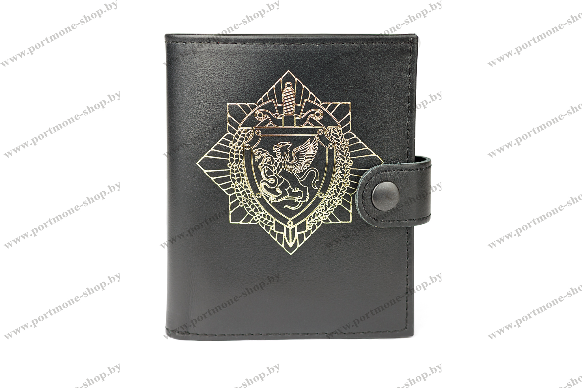 На лицевой стороне нанесено золотое тиснение: эмблема УНиПТЛ КМ МВД РБ. По желанию к ней может быть добавлена надпись "Министерство внутренних дел Республики Беларусь". Под заказ возможно нанесение других тиснений (примеры в галерее к товару), а так же установка любых винтовых знаков (предоставляются заказчиком).