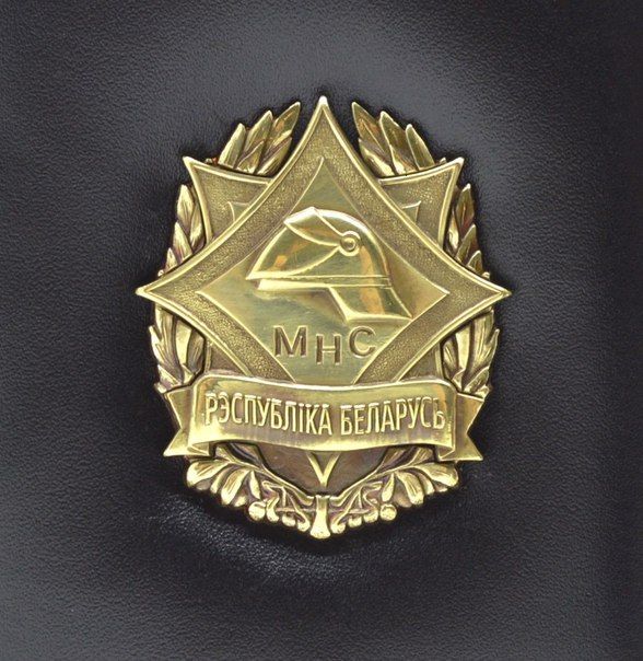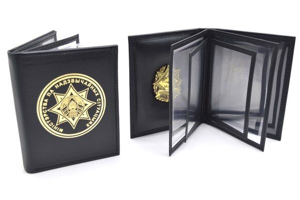 На обложке для документов из кожи золотом вытеснена эмблема Министерства по чрезвычайным ситуациям Республики Беларусь, на развороте установлен латунный знак.