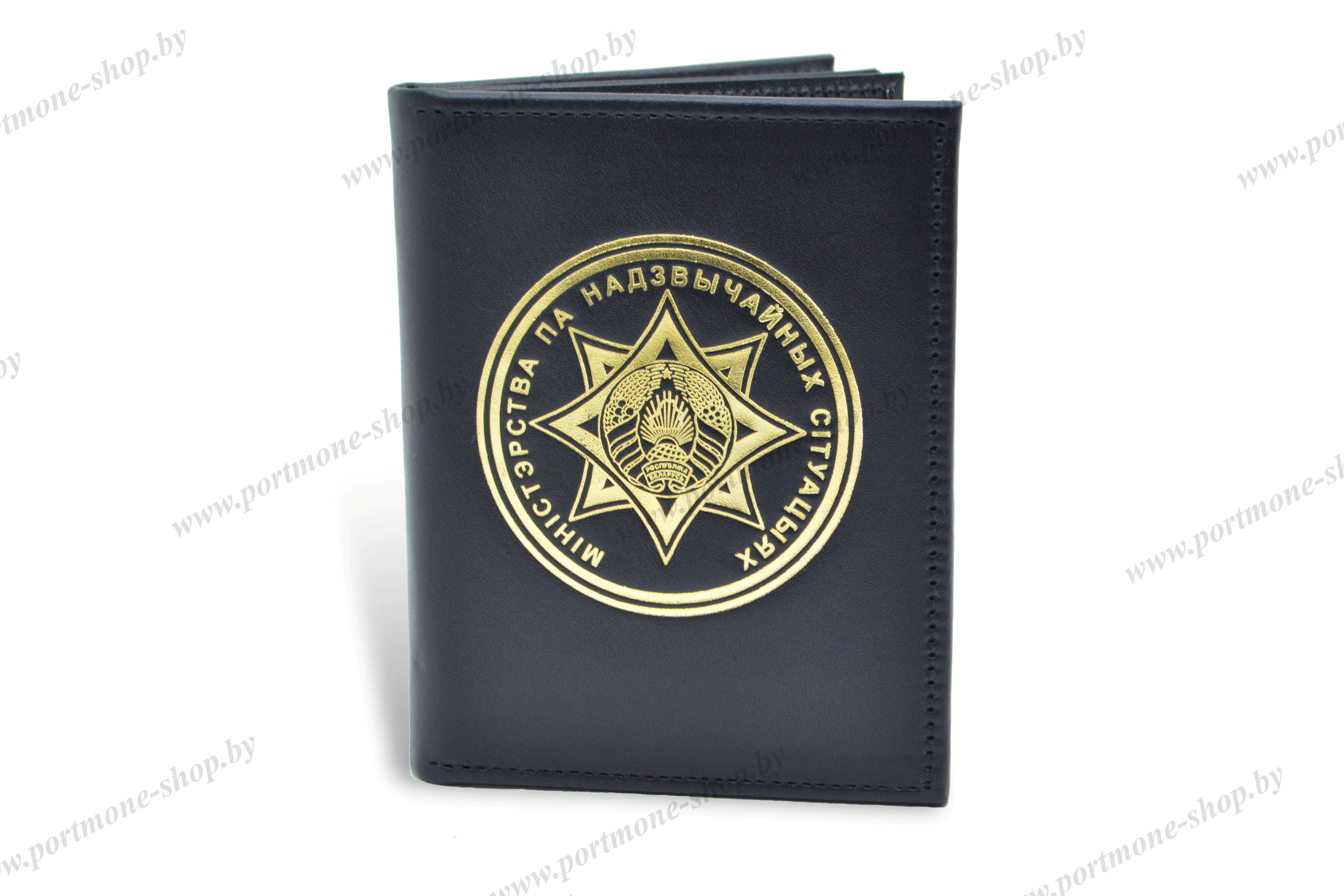 Обложка для документов из кожи с тиснением МЧС Республики Беларуси и металлическим знаком на развороте для хранения удостоверения и автодокументов.