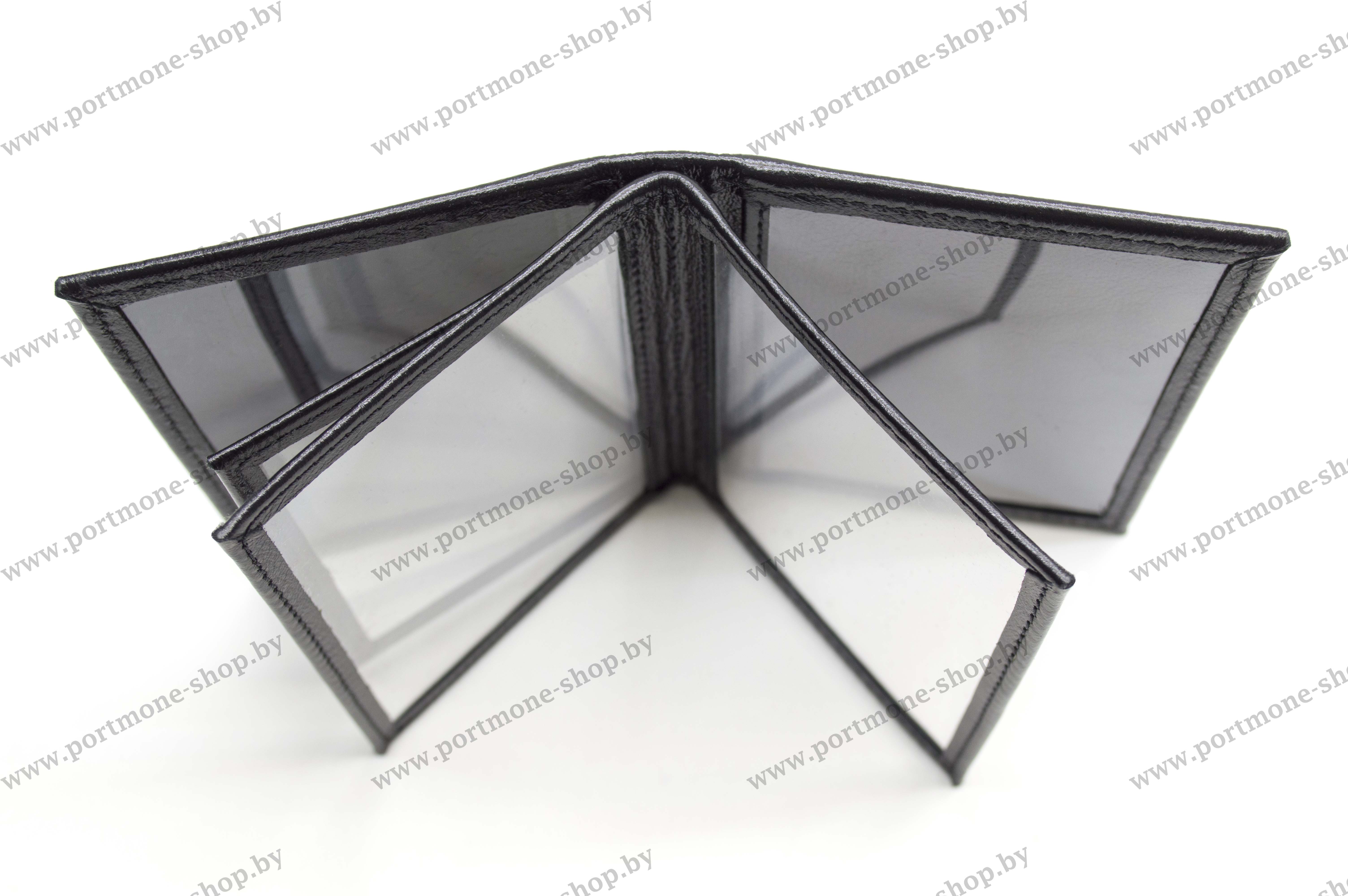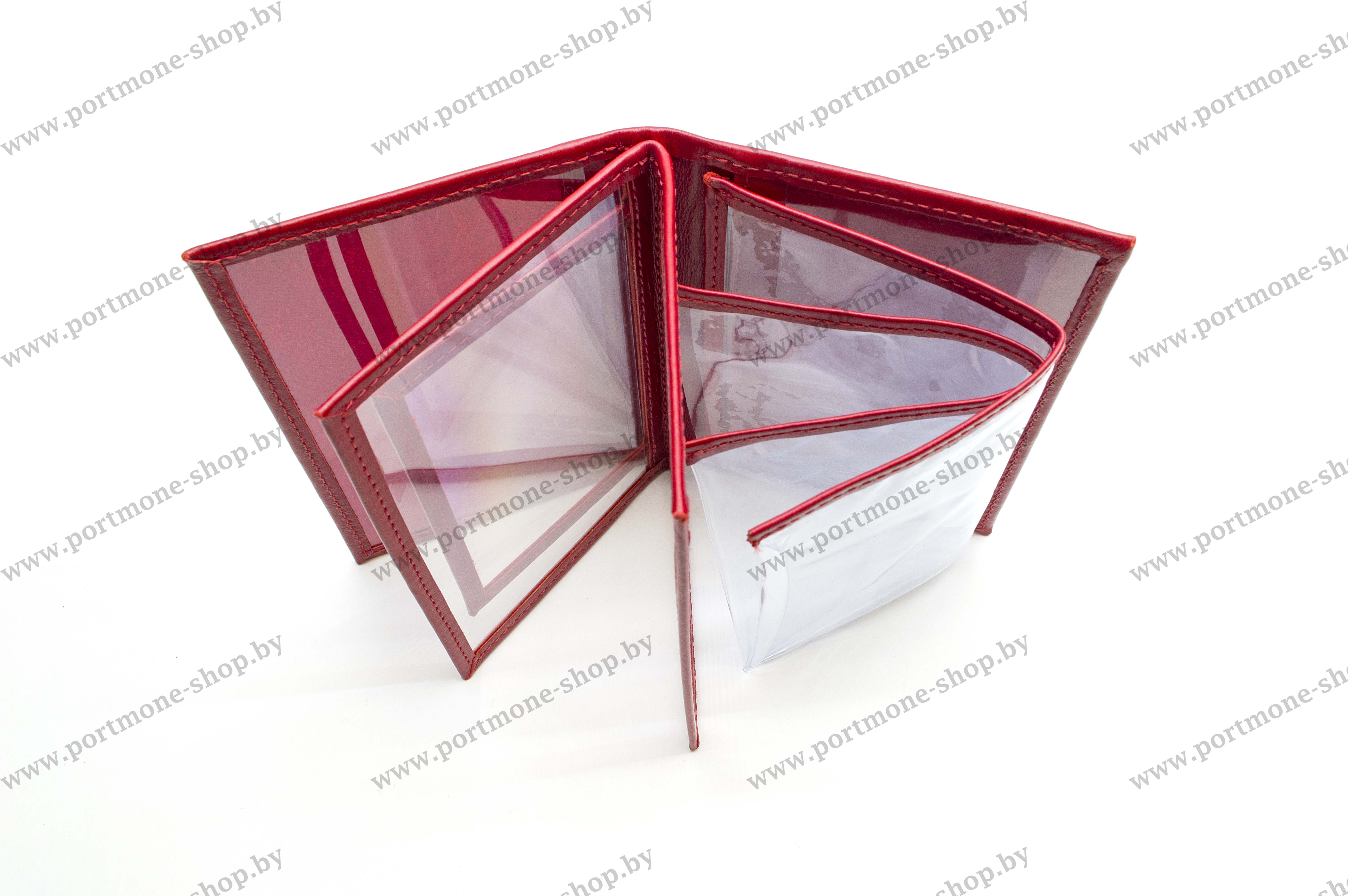 По центру расположен один небольшой отсек для документов размером 95*65мм (водительское удостоверение) и два больших отсека для иных документов размером до 125*85мм (техпаспорт, сертификат ТО, страховка в сложенном виде и пр.).На первом развороте имеется один прозрачный карман для документов 125*85мм, на последнем - два кармана для документов 125*85 (один прозрачный, второй - из кожи).
