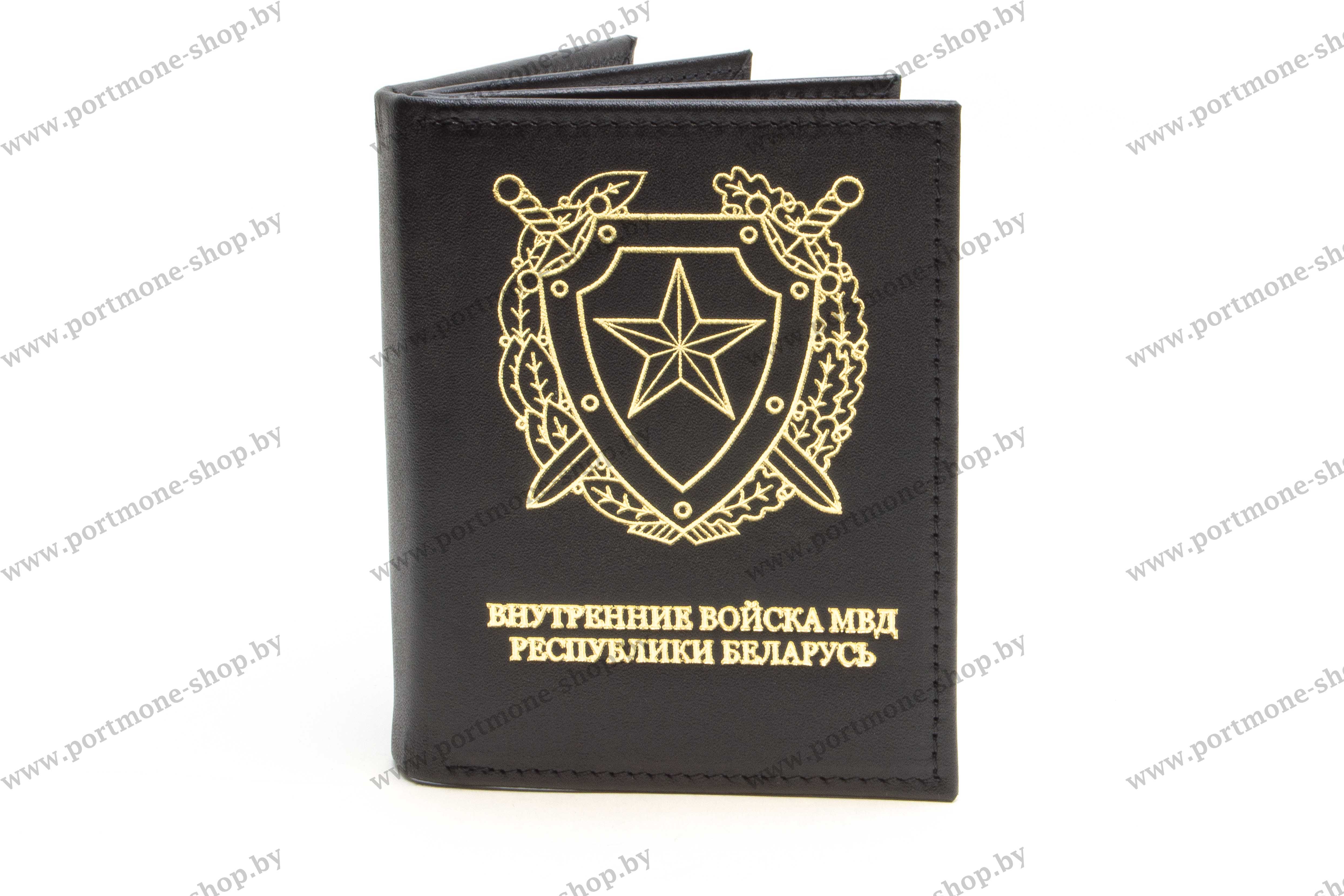 Сувенирная обложка для автодокументов сотрудников Внутренних войск МВД Республики Беларусь из натуральной кожи. На первом развороте имеется прозрачный карман для документов 105*75мм. По центру расположены в зависимости от модификации один или три небольших отсека для документов размером 95*65мм (водительское удостоверение, пропуск, банковская карточка) и два больших отсека для иных документов размером до 105*75мм (техпаспорт, страховка в сложенном виде и пр.). На последнем развороме имеются 2 прозрачных кармана для документов 105*75 (один прозрачный, второй - из кожи). На лицевой стороне нанесено золотое тиснение: эмблема Внутренних войск Республики Беларусь и надпись "Внутренние войска МВД Республики Беларусь". Под заказ возможно нанесение других тиснений (примеры в галерее к товару), а так же установка любых винтовых знаков (предоставляются заказчиком).