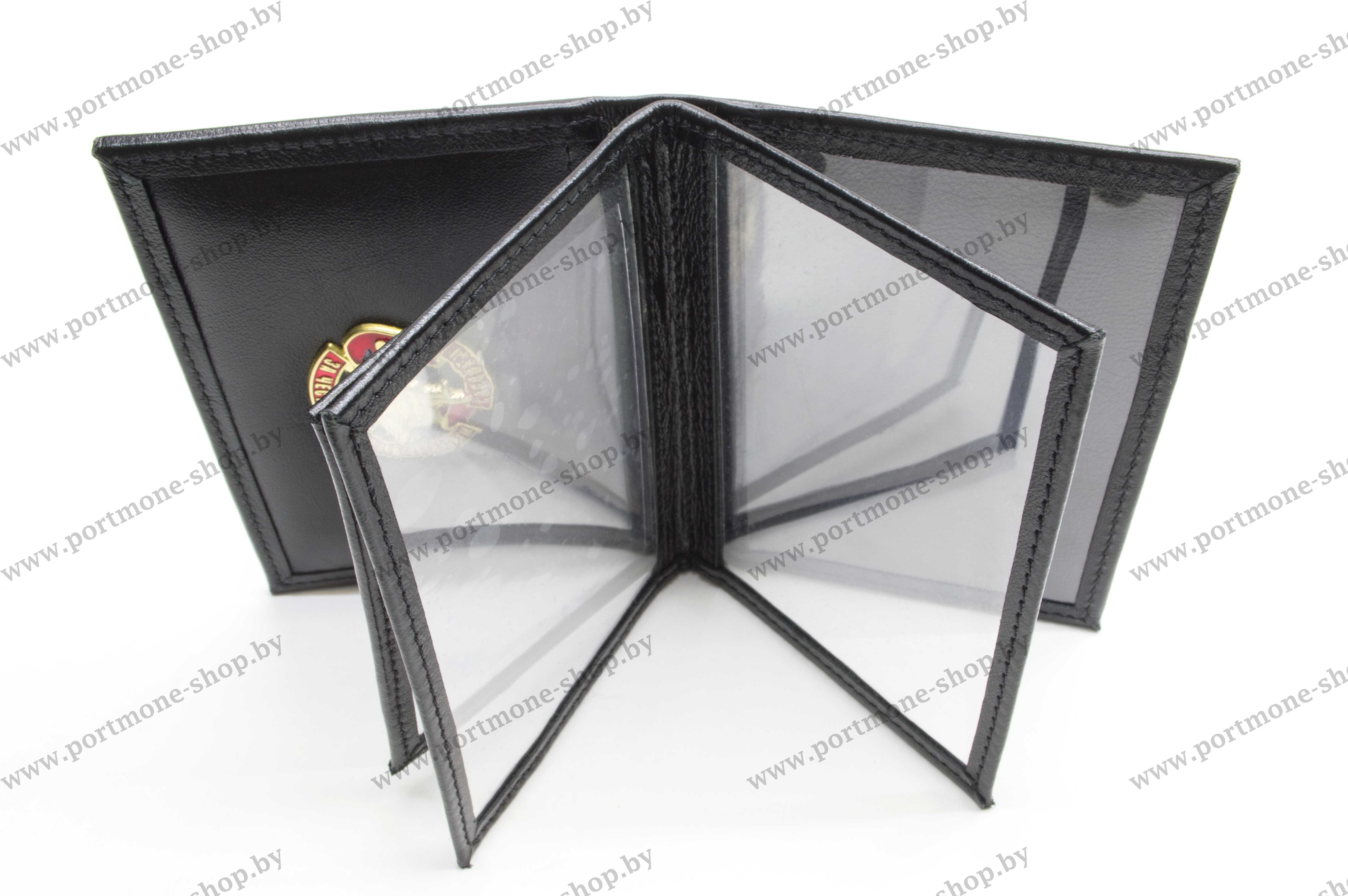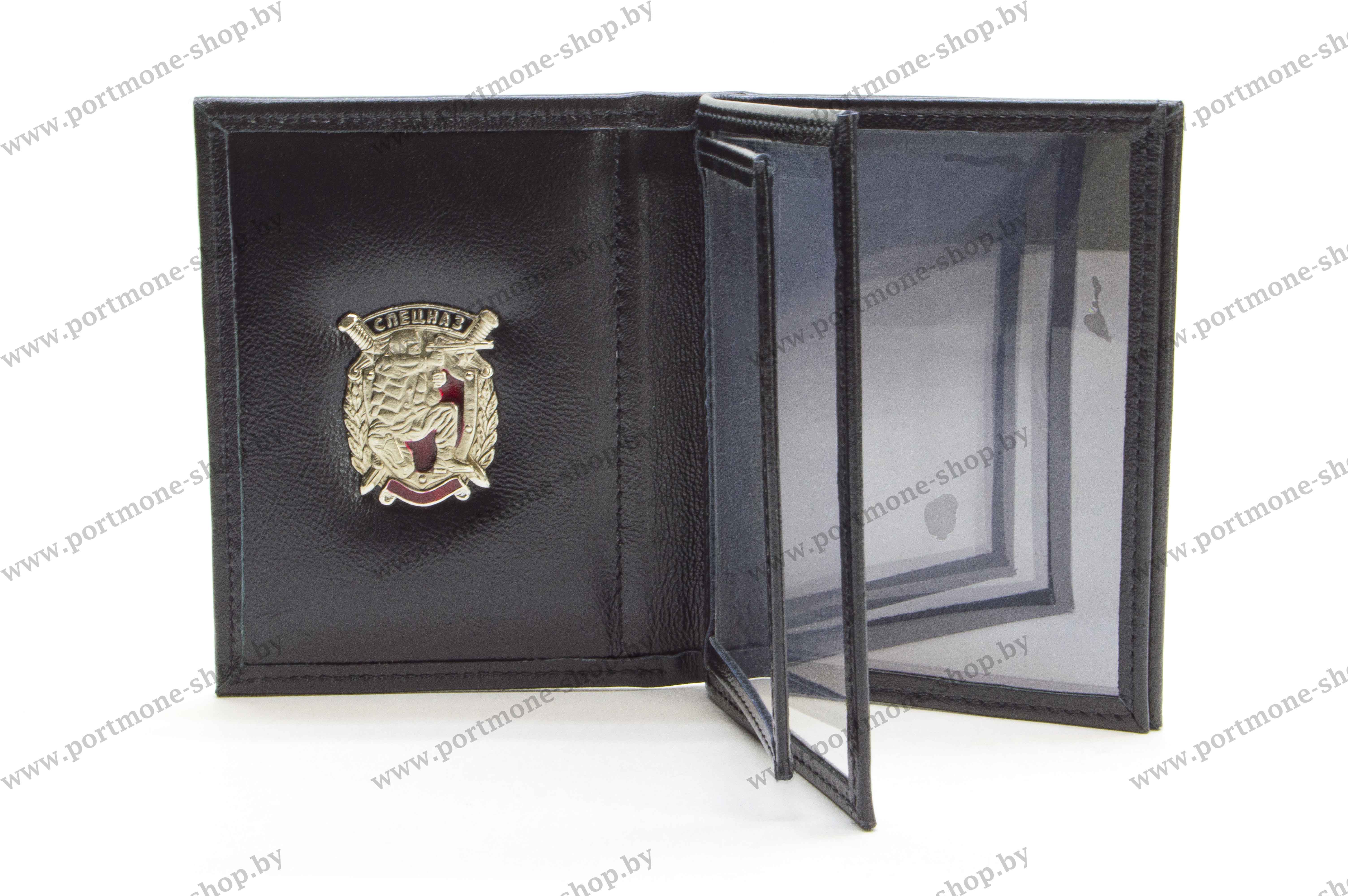 Обложка из натуральной кожи с тисненой эмблемой Спецназа. Внутри расположены один небольшой карман под водительское удостоверение/пропуск и два больших кармана для документов 75*105мм. На первом форзаце установлен знак, на последнем форзаце расположен карман.