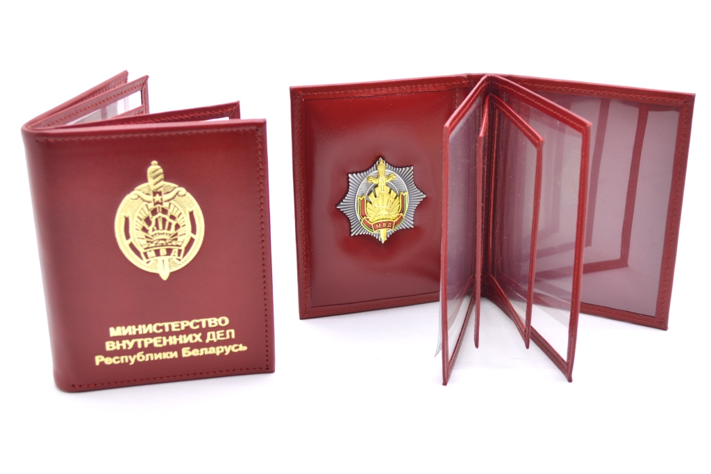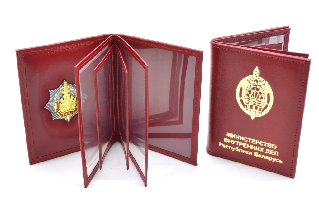 Обложка из натуральной кожи красного цвета с символикой МВД РБ для хранения милицейского удостоверения, карточек-заместителей на оружие и радиостанцию, автодокументов. Купить обложку для документов с доставкой покупки по Беларуси, в Россию, по СНГ или в другие государства.