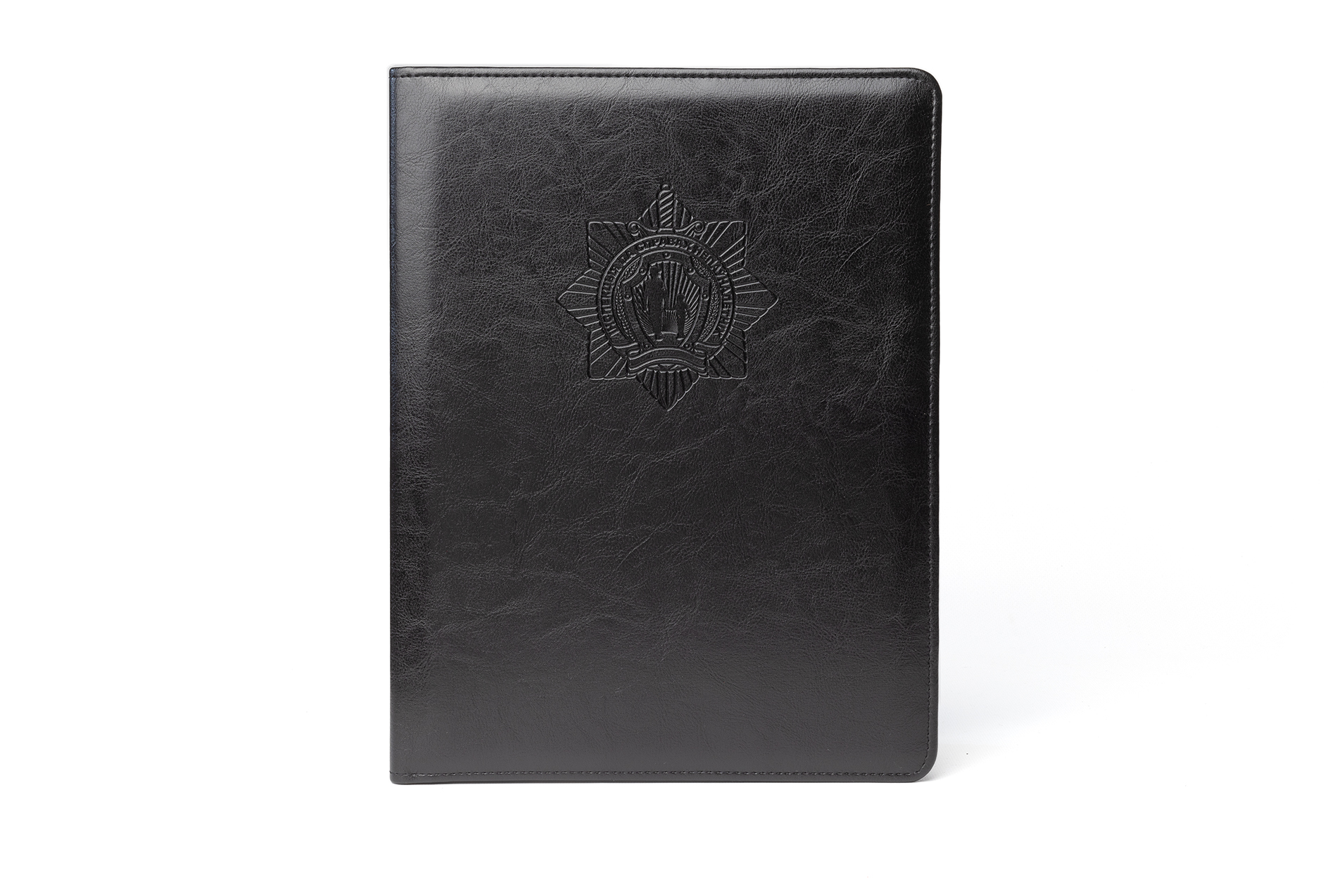 Папка из качественной искусственной кожи с тисненой эмблемой Инспекции по делам несовершеннолетних МВД Республики Беларусь. Папка предназначена для удобного хранения документов формата А4, а для более надежного ношения в папке предусмотрен зажим.