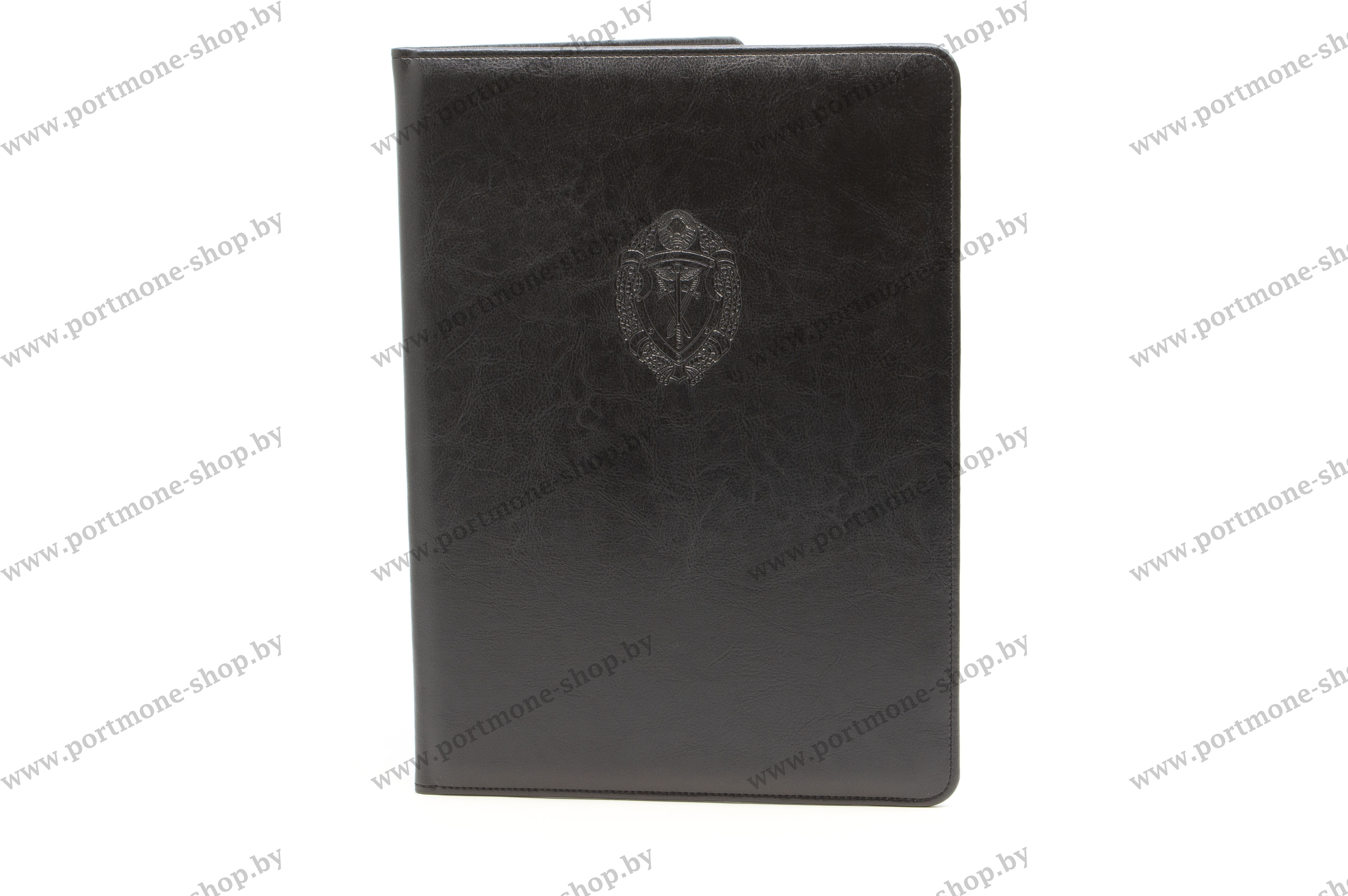 Папка формата А4 с тисненой эмблемой Департамента финансовых расследований Республики Беларусь выполнена из искусственной кожи с прижимным механизмом для документов. Папка может изготавливаться в любом цвете. Такая же модель может быть из натуральной кожи с золотым/серебряным/бесцветным тиснением.
