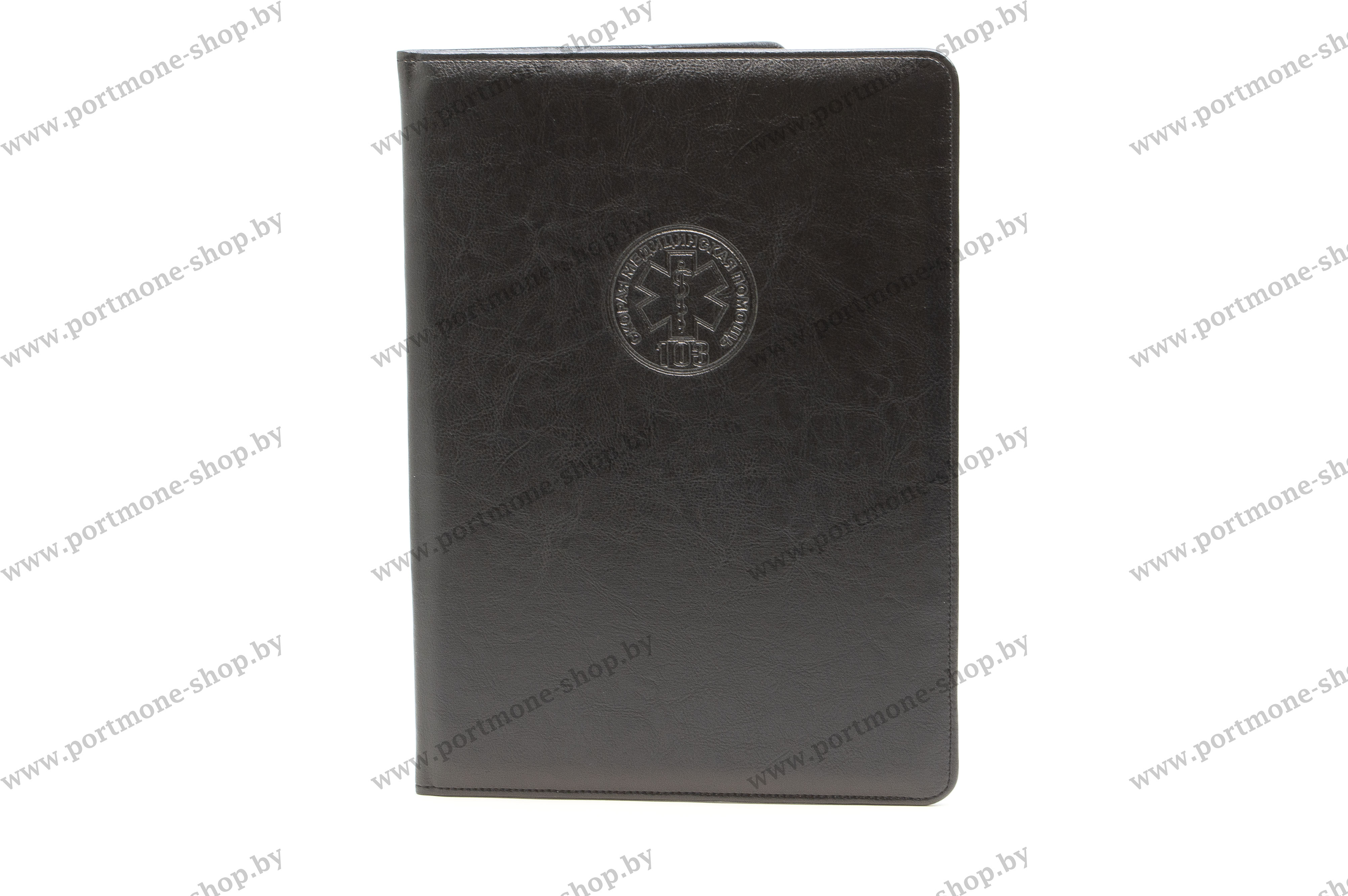 Папка с эмблемой Скорой медицинской помощи формата А4 из искусственной кожи. Папка может изготавливаться в любом цвете. Такая же модель может быть из натуральной кожи с золотым/серебряным/бесцветным тиснением.