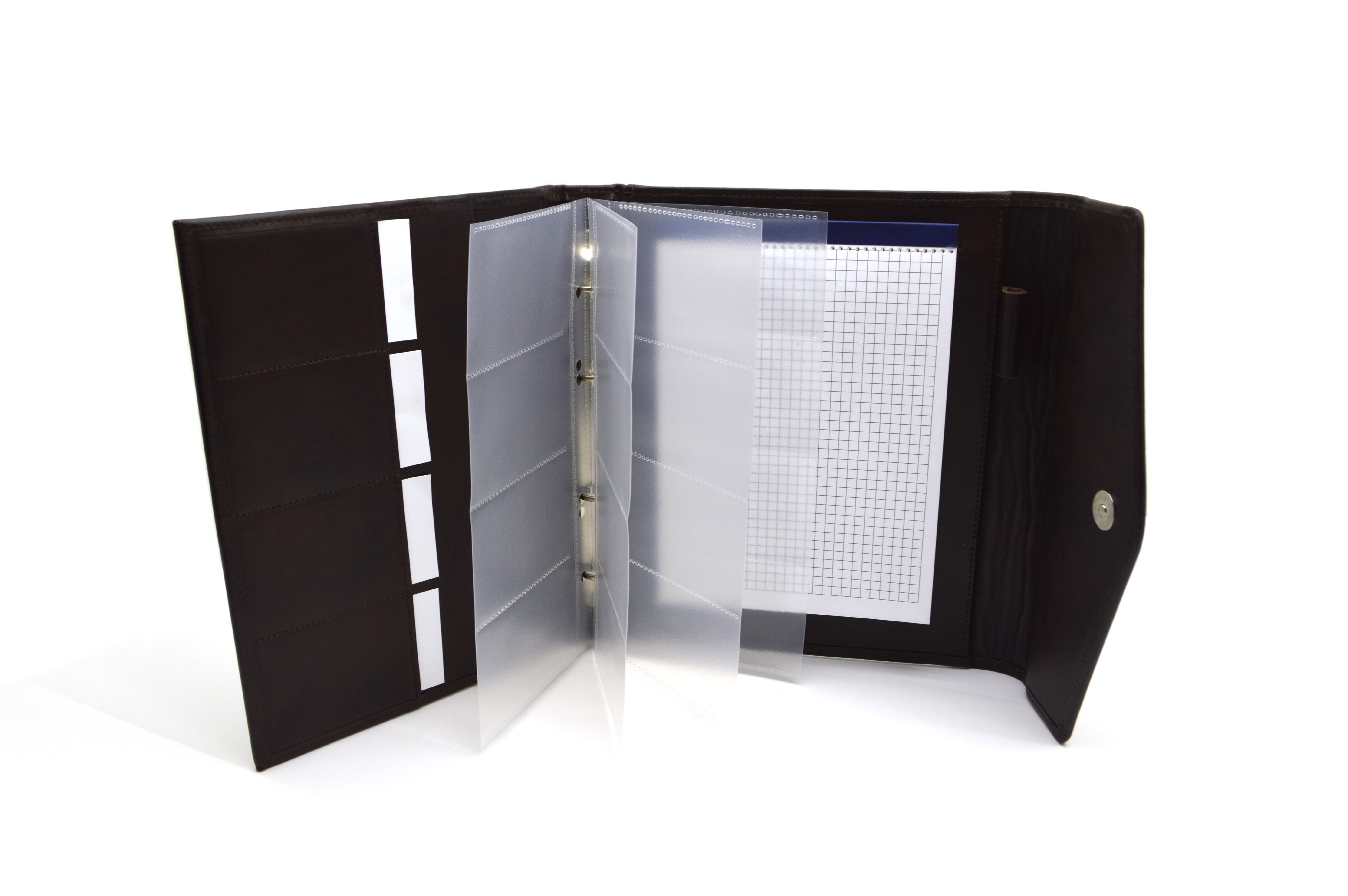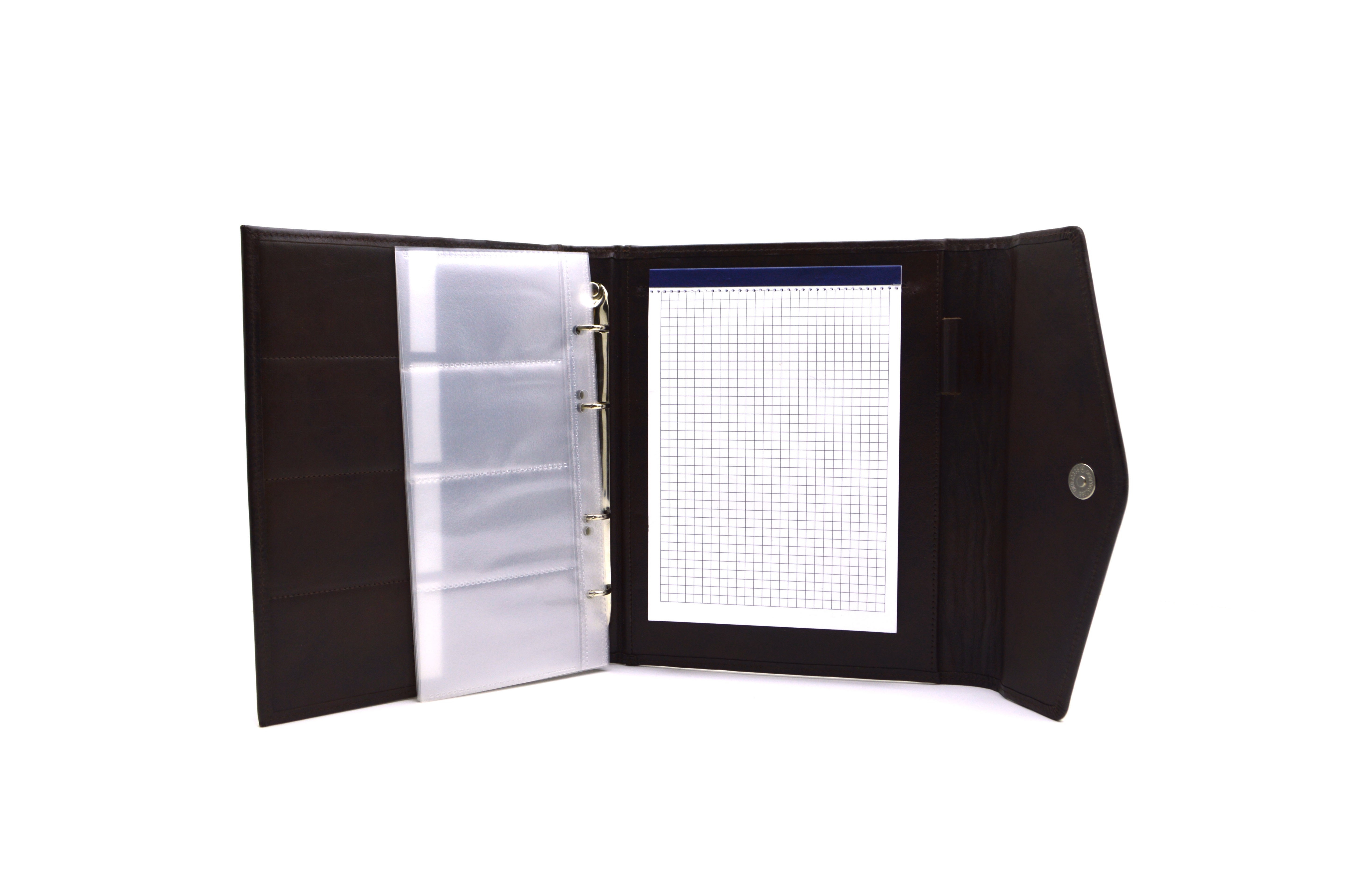 Внутри имеется кольцевой механизм для установки файлов с боковой перфорацией под визитки или документы формата А5.