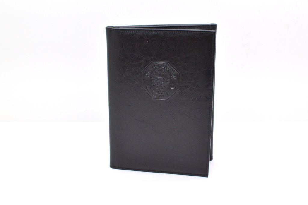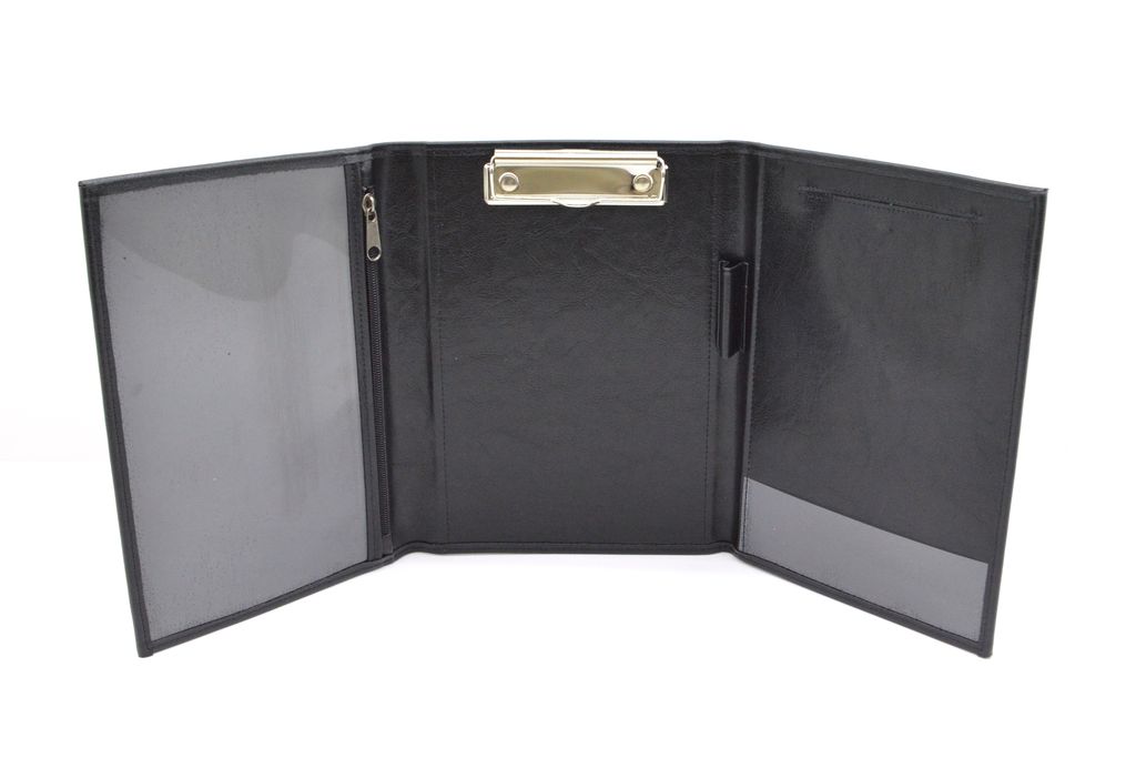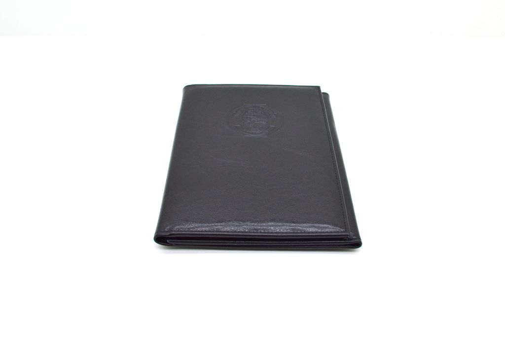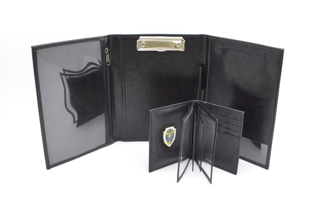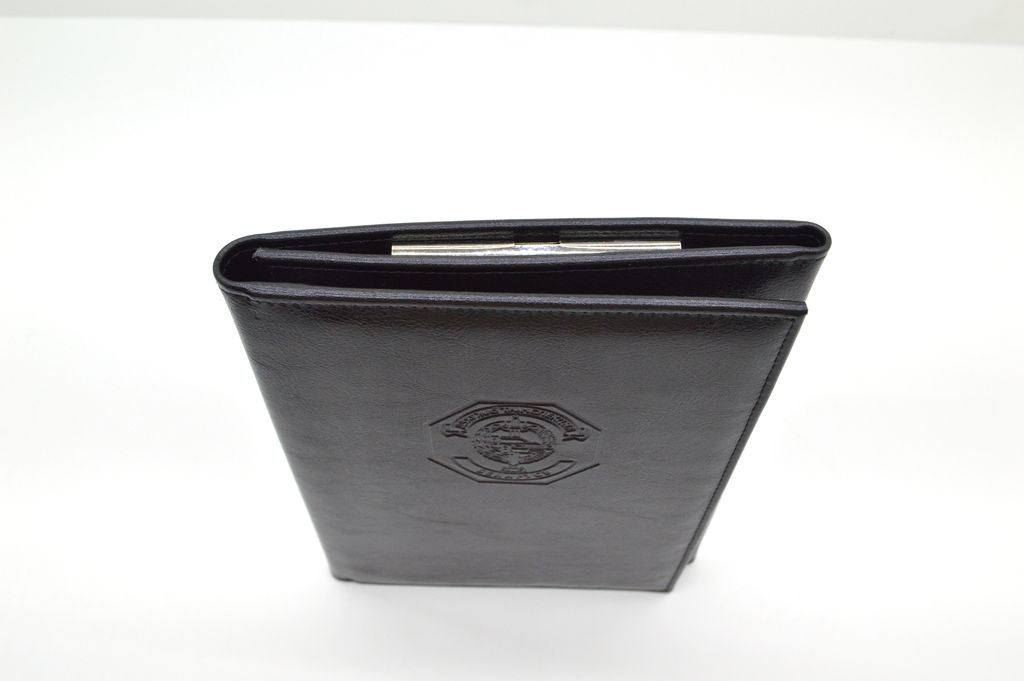 Малогабаритная папка из искуственной кожи черного цвета и тиснением ГАИ Республики Беларусь. За счёт небольших размеров её очень удобно хранить и перевозить в патрульном автомобиле. Закрывается в три сложения. Предназначена для хранения служебных документов формата А5 и блока отрывных квитанций для оплаты штрафов за нарушение ПДД.