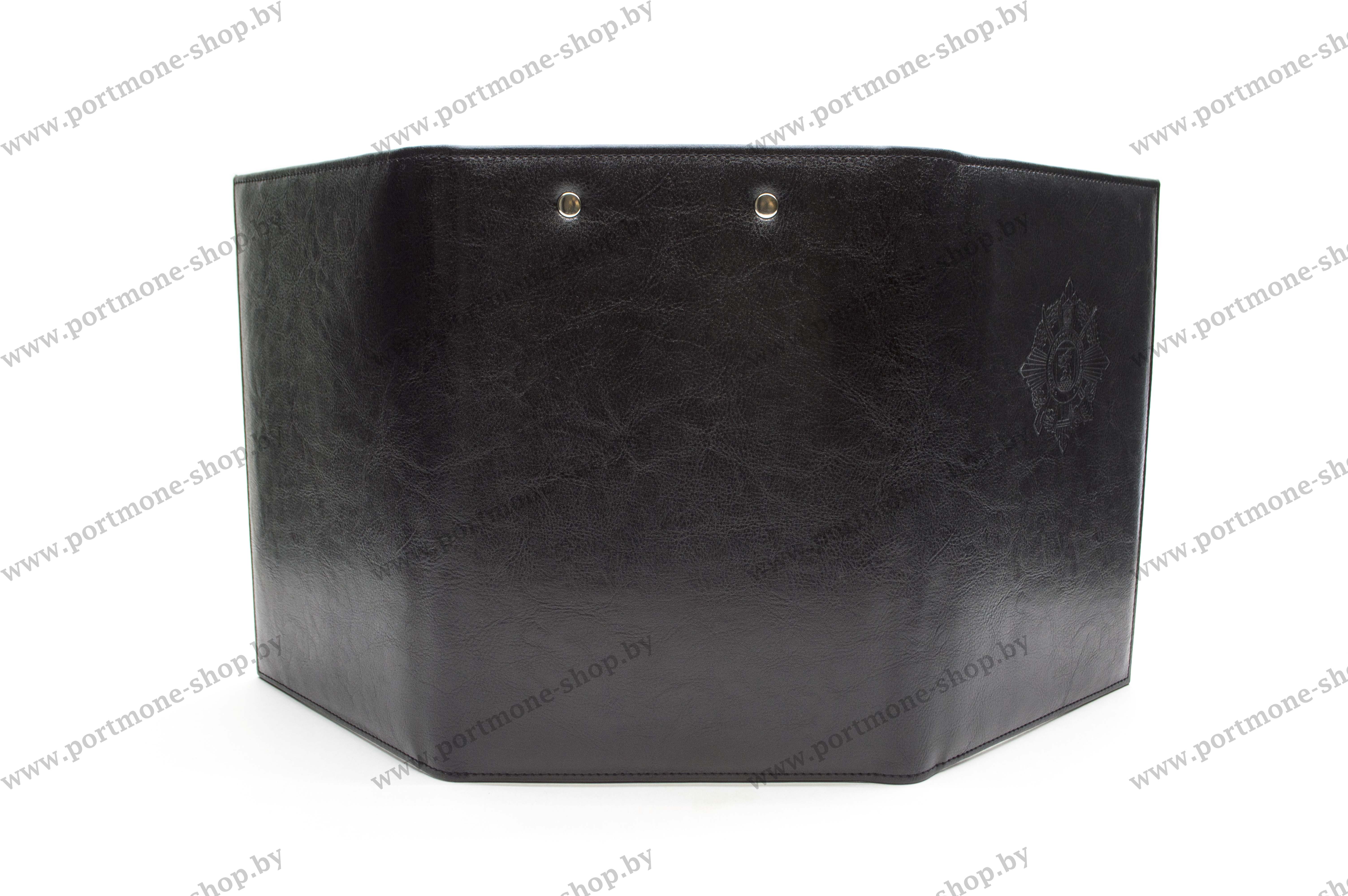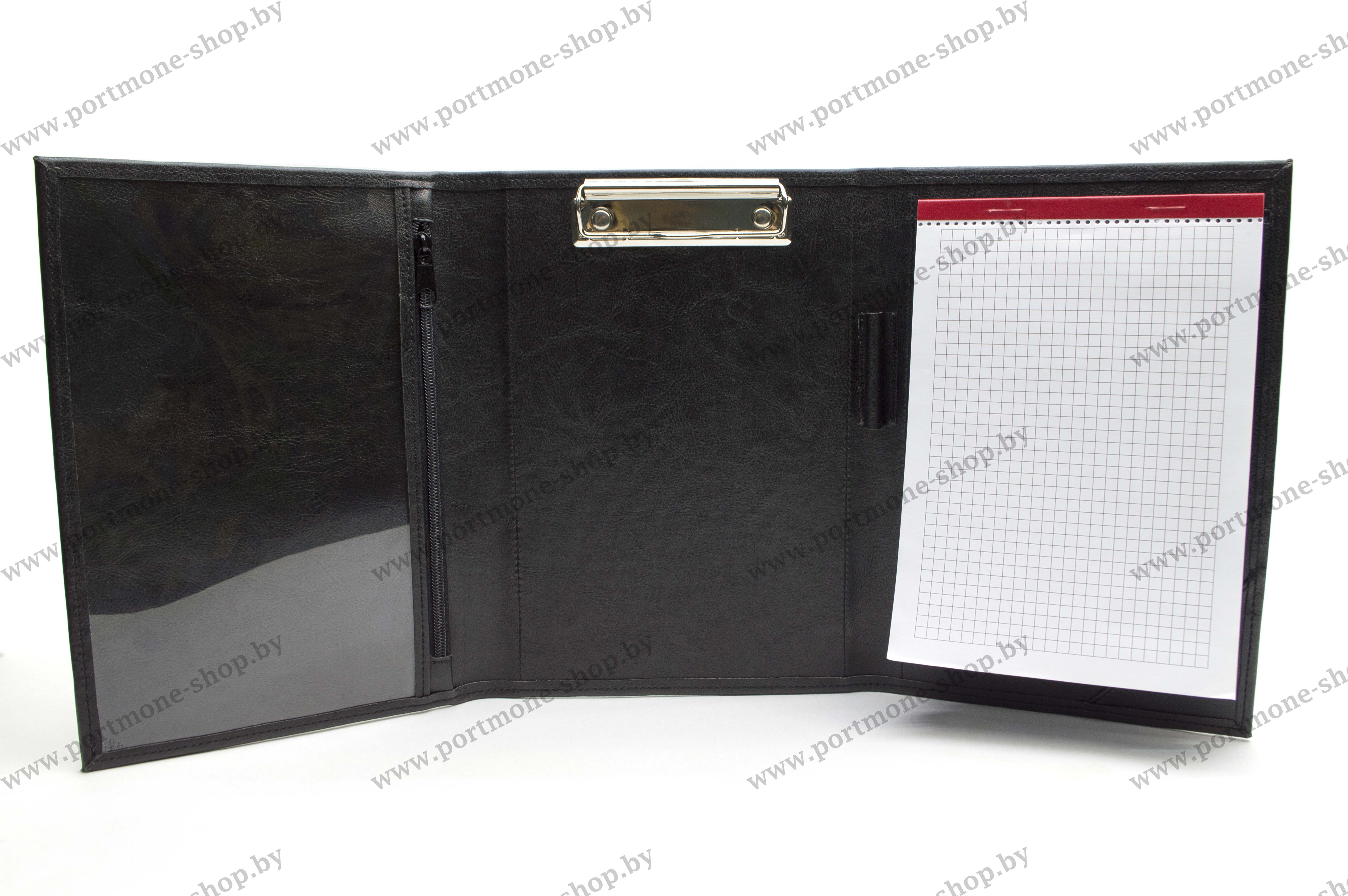 Папка формата А5 с прозрачным карманом, карманом на молнии, прижимным механизмом и прорезью под блокнот. Материал искусственная кожа. Возможно изготовление из натуральной кожи.