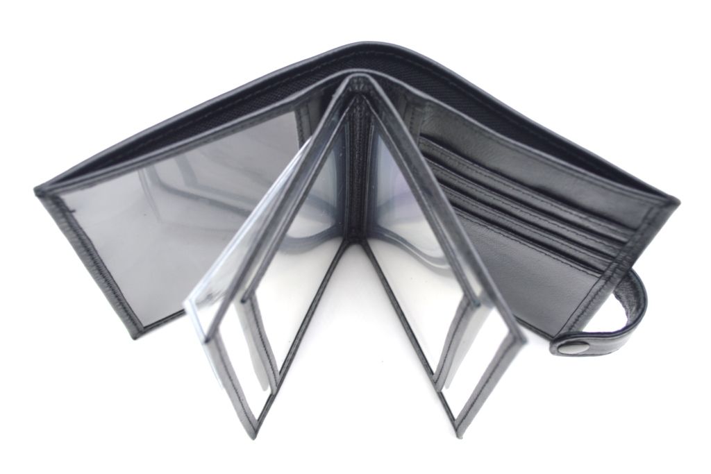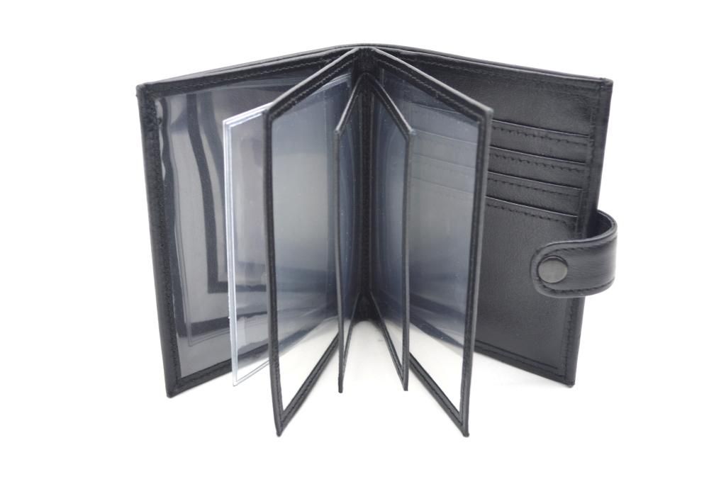 По центру портмоне для денег документов имеются отсеки, изготовленные из прозрачного ПЭТФ, обшитые для надёжности и долговечности кожаными полосками. В них можно хранить служебное удостоверение, водительские права, техпаспорт и пр. На заднем форзаце предусмотрено место под четыре кредитные или дисконтные карты.