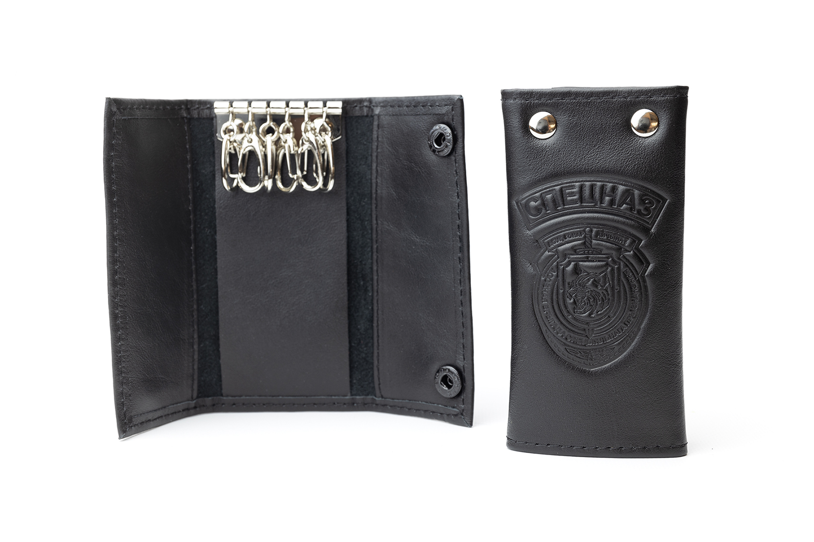 Ключница с карабинами для ключей и кармашками. Выполнена из натуральной кожи. Возможно нанесение тиснения (глубокое бесцветное, глянцевое, золото или серебро).