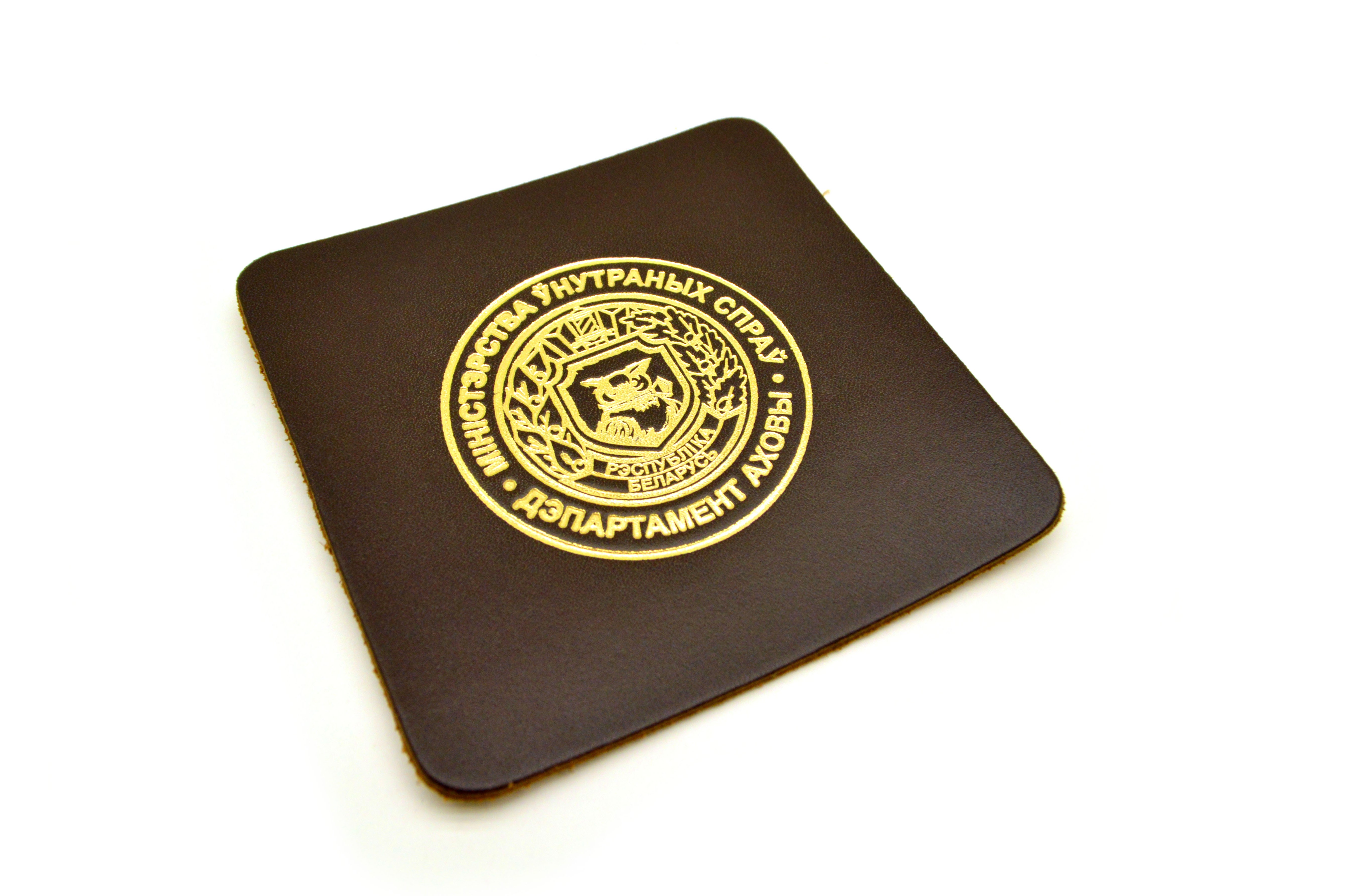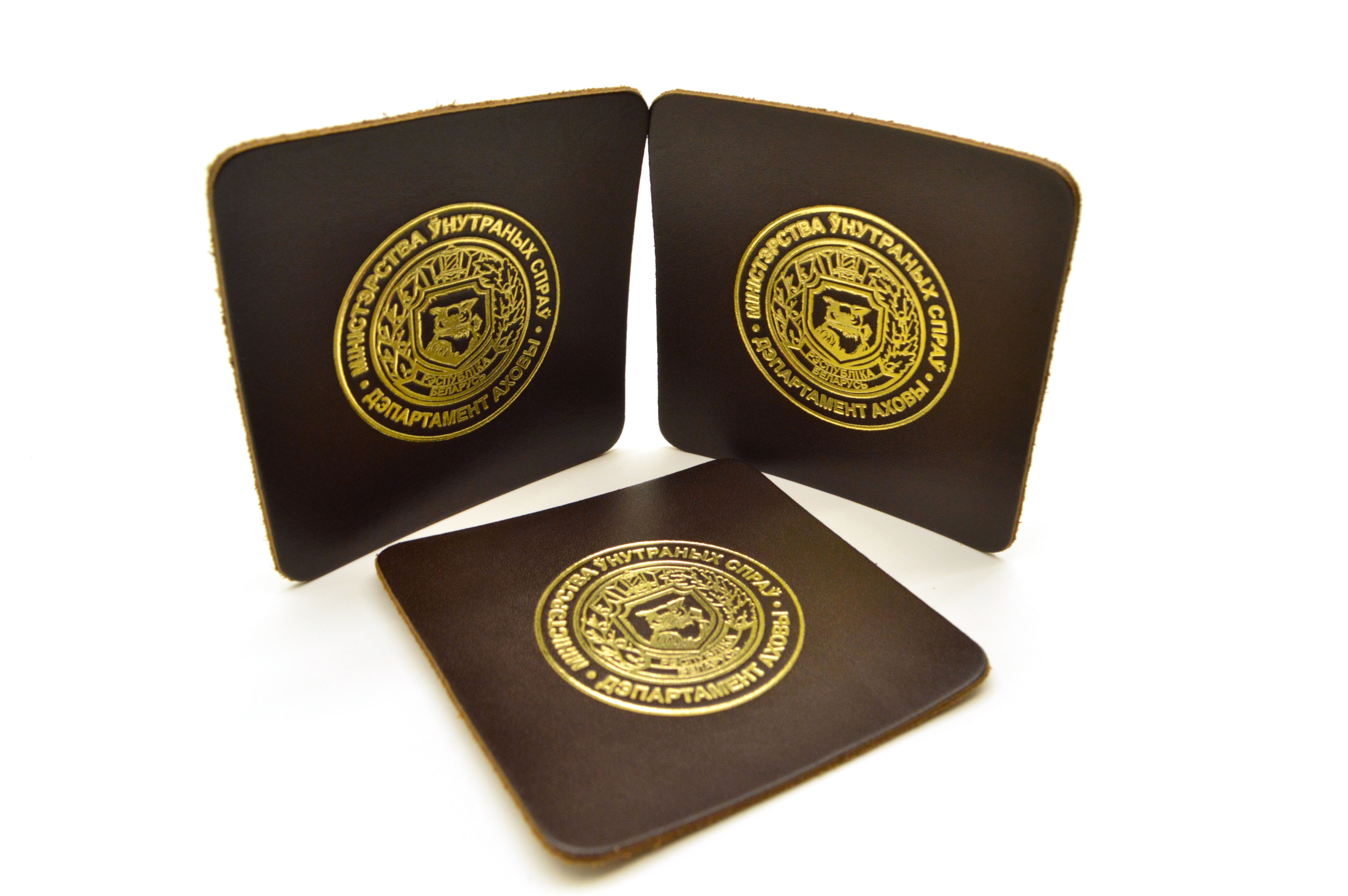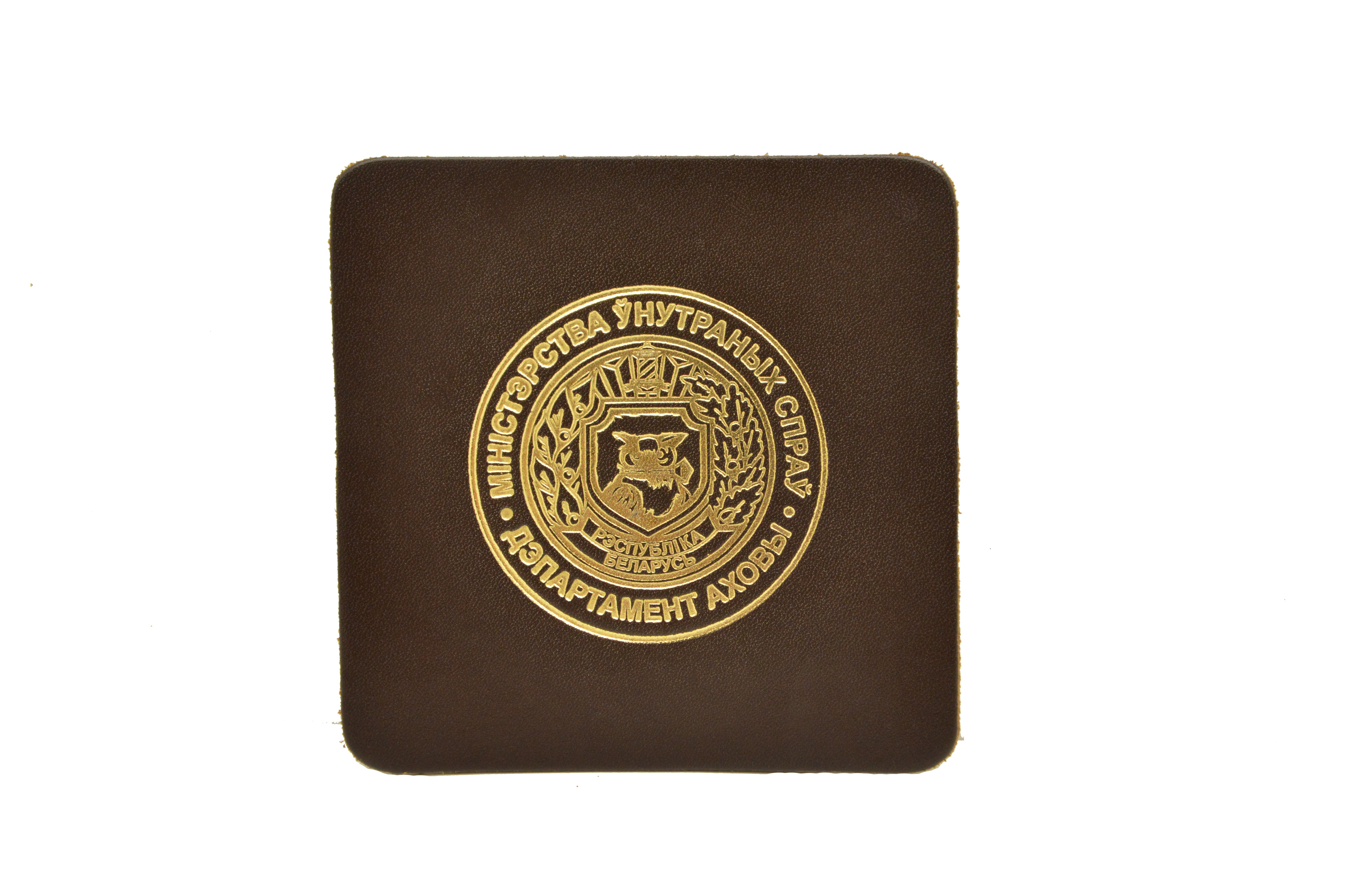 Подставка под чашку из натуральной кожи с тисненой эмблемой Департамента охраны МВД Республики Беларусь.