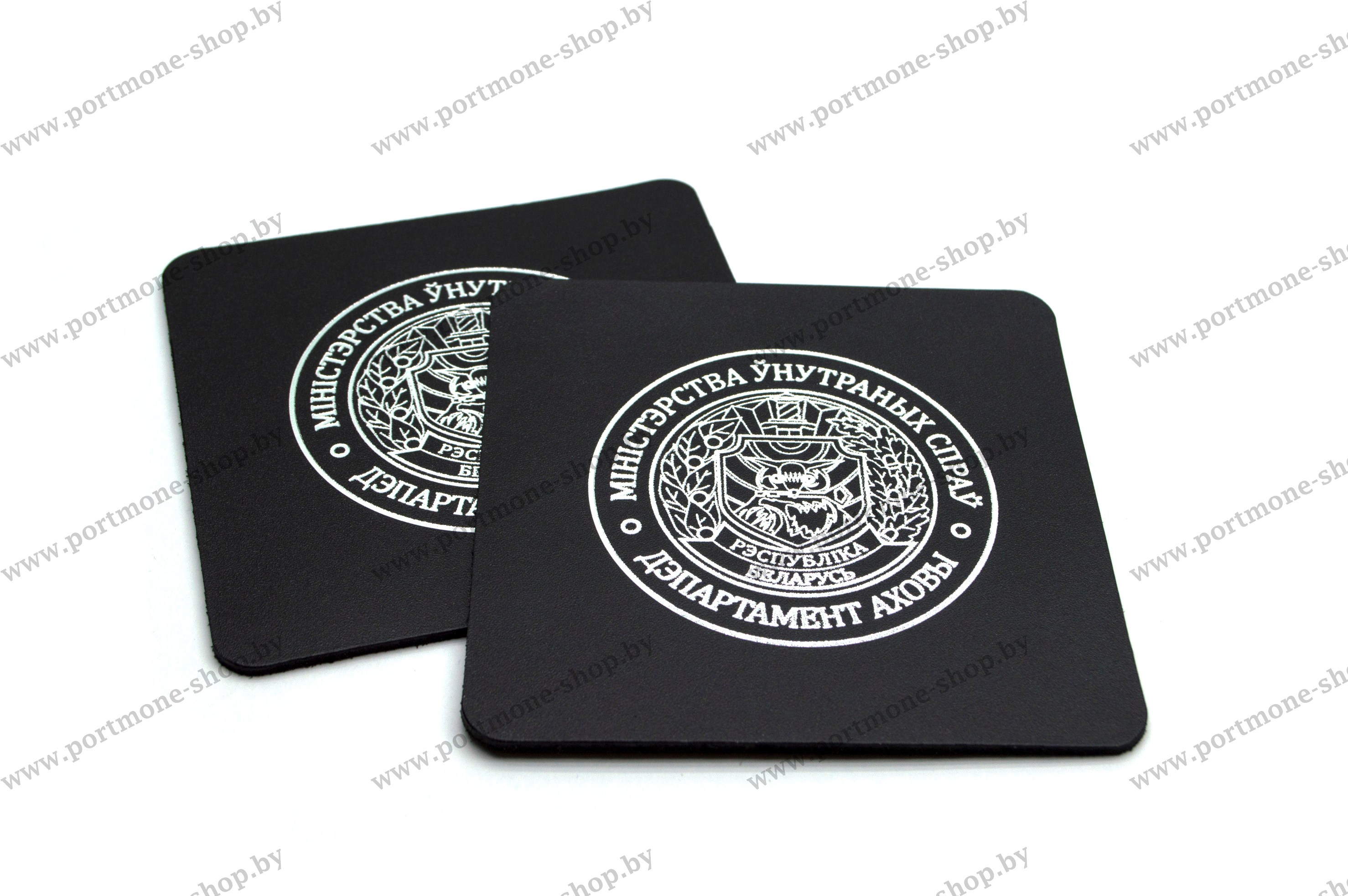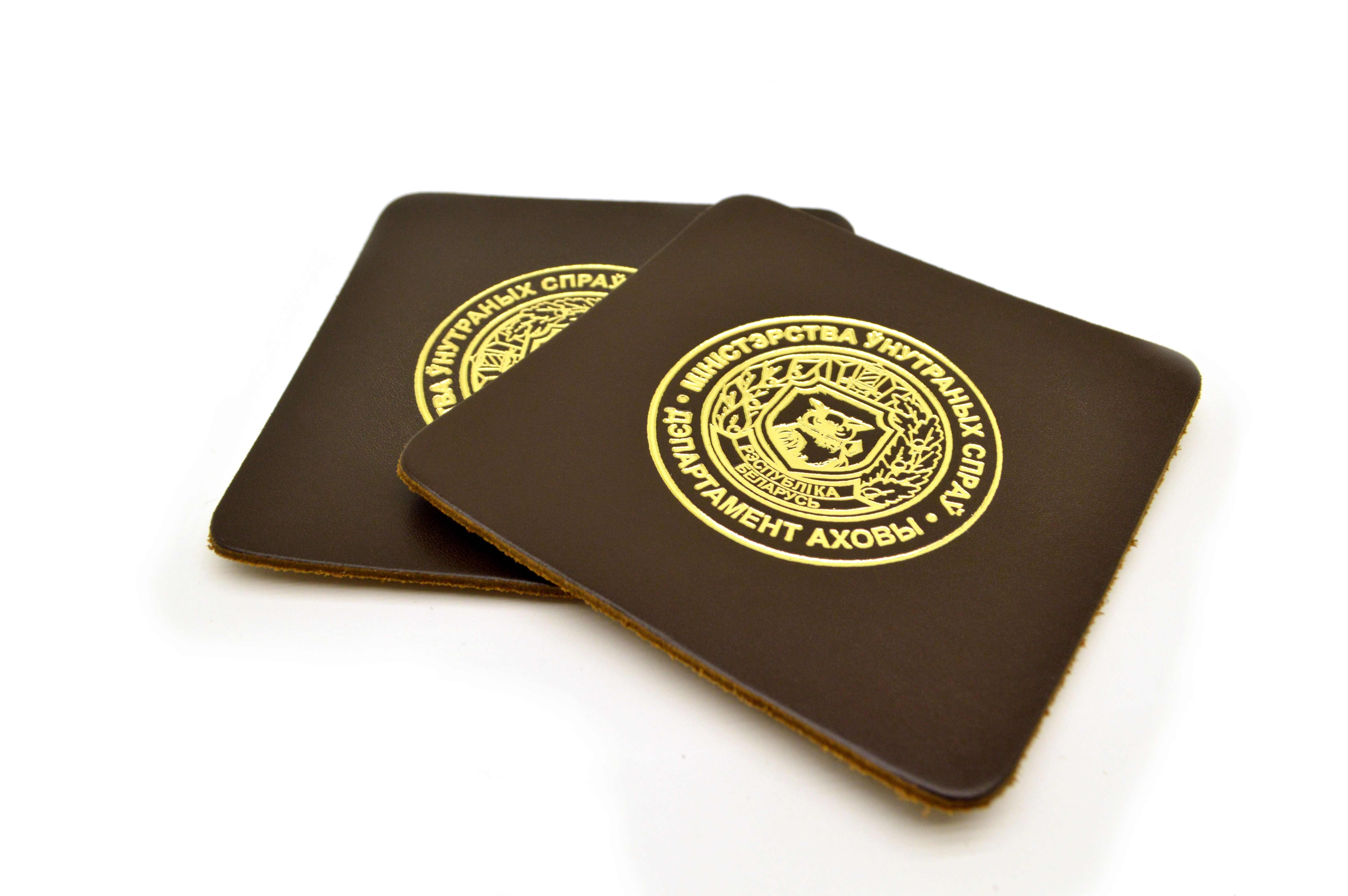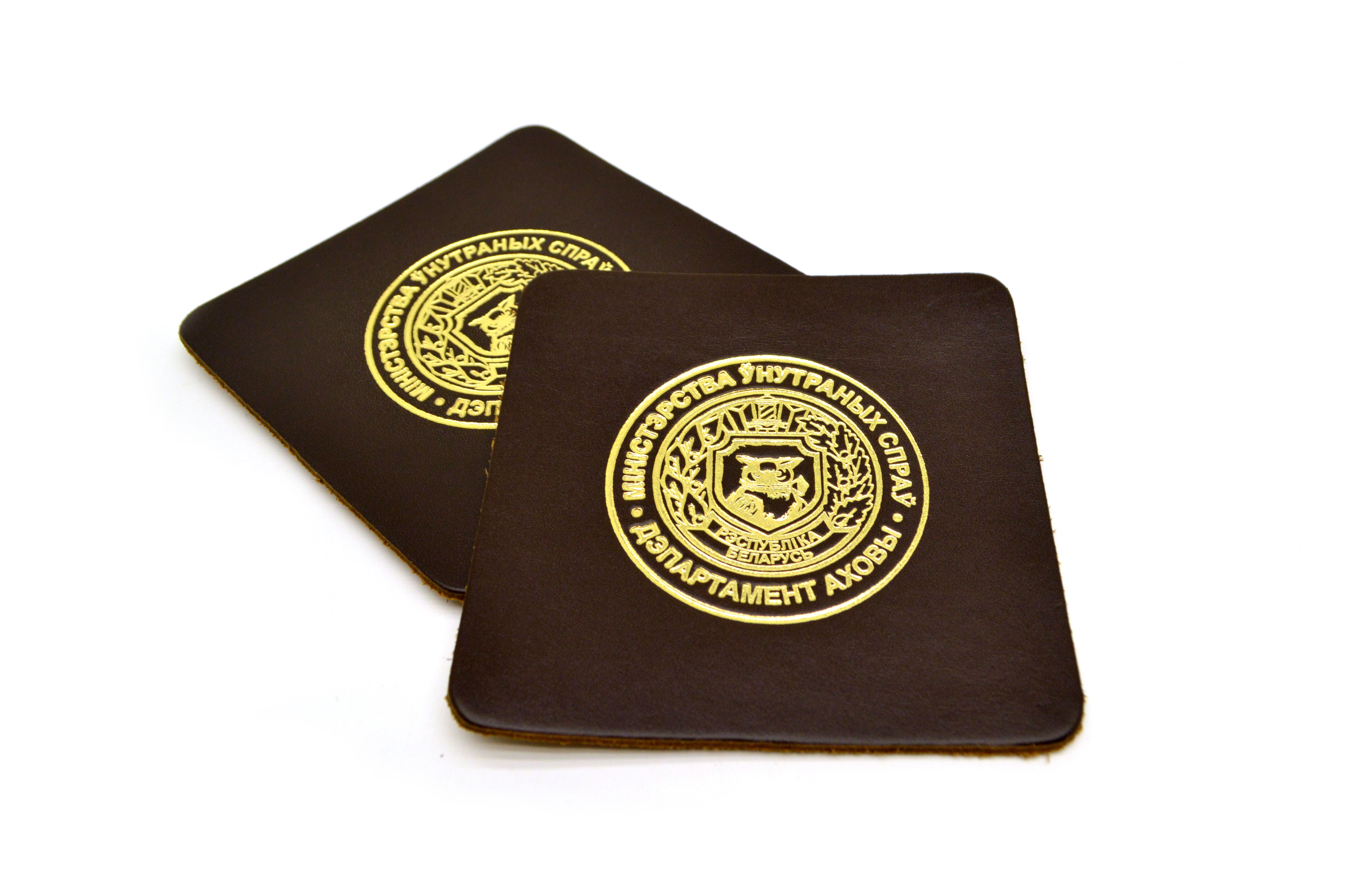Подставка под чашку из натуральной кожи с тисненой эмблемой Департамента охраны МВД Республики Беларусь.